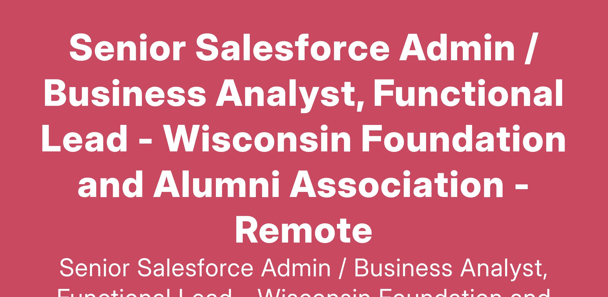 The Wisconsin Foundation and Alumni Association (WFAA)* is seeking a highly skilled and dynamic Senior Salesforce Admin/Business Analyst, Functional Lead to play a pivotal role in managing and optimizing WFAA’s CRM ecosystem. This position will focus on identifying, evaluating, and implementing innovative solutions within the Salesforce platform. As a leader, you will develop and enforce best practices for Salesforce administration and business analysis, increase operational efficiency, challenge the status quo, empower team members and users, and ensure data stewardship.