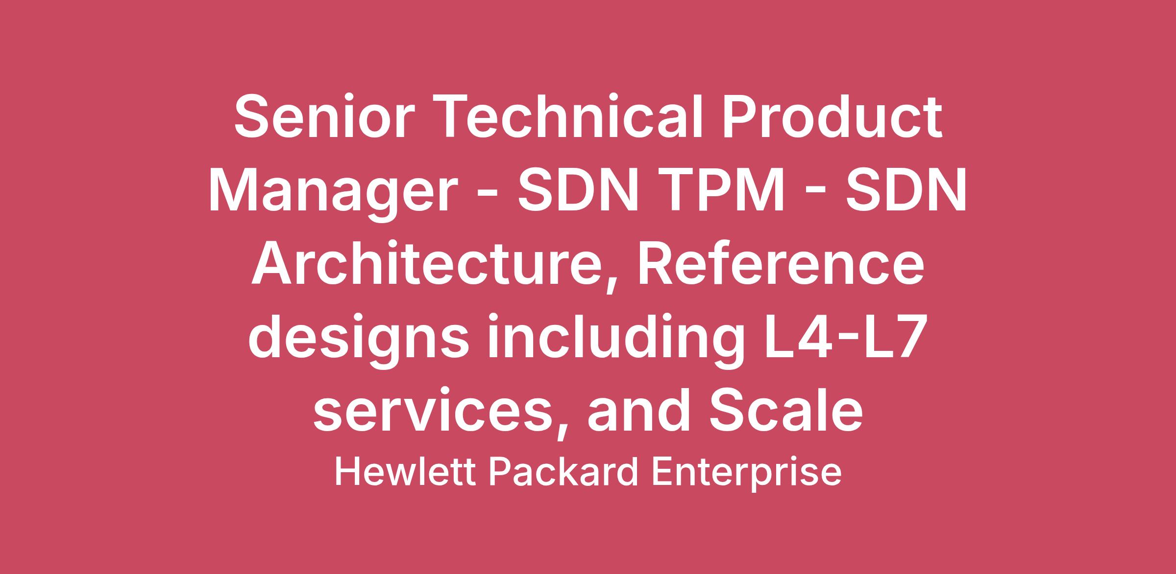 Senior Technical Product Manager - SDN TPM - SDN Architecture, Reference designs including L4-L7 services, and Scale This role has been designed as ‘Hybrid’ with an expectation that you will work on average 2 days per week from an HPE office.Who We Are:Hewlett Packard Enterprise is the global edge-to-cloud company advancing the way people live and work. We help companies connect, protect, analyze, and act on their data and applications wherever they live, from edge to cloud, so they can turn insights into outcomes at the speed required to thrive in today’s complex world. Our culture thrives on finding new and better ways to accelerate what’s next. We know varied backgrounds are valued and succeed here. We have the flexibility to manage our work and personal needs. We make bold moves, together, and are a force for good. If you are looking to stretch and grow your career our culture will embrace you. Open up opportunities with HPE.Job Description: The SDN Technical Product Manager is responsible for driving SDN architecture and delivering scalable reference designs, including L4–L7 network services. This role coordinates cross-functional teams to define, document, and validate SDN solutions that meet performance, scale, and reliability requirements. The TPM works closely with engineering, field and customers to ensure architectures are production-ready, support advanced network services, and scale across enterprise and service provider environments.Management Level Definition:Contributions impact technical components of HPE products, solutions, or services regularly and sustainable. Applies advanced subject matter knowledge to solve complex business issues and is regarded as a subject matter expert. Provides expertise and partnership to functional and technical project teams and may participate in cross-functional initiatives. Exercises significant independent judgment to determine best method for achieving objectives. May provide team leadership and mentoring to others.Responsibilities:Leads and drives the end to end strategy and operational product roadmap for one or more products.Defines the value proposition, target customer segments, and business case to bring one or more innovative and disruptive products to market with respect to the whole company product portfolio (i.e. Product configuration mix, Revenue/Margins, financials, market share).Synthesizes market requirements (MRD) into marketing/customer details through having intimate customer knowledge and business, financial and industry market acumen.Advises key stakeholders on the portfolio strategy across all phases of the lifecycle (e.g., planning, development, launch, management, exit).Creates and drives goal alignment and collaborates across one or more products' value chain partners to optimize margins and enable success of products per plans across the product lifecycle. (ie. Engineering: product development, Supply Chain: SKUs, inventory and Marketing: marketing and pricing strategies and Go To Market Plan).Education and Experience Required:Bachelor's degree or equivalent in computer science, engineering or related field of study. MBA or advanced degree in computer science or engineering preferred.8+ years of work experience in related field.Technical understanding and knowledge of the relevant industry.Knowledge and Skills:Expert team skills and ability to cross functionally drive/influence work through others, ability to mentor and lead teams to achieve results for complex, ambiguous projects.Expert skills in cost efficient solution building, financial performance metric creation and analysis.Expert business acumen and knowledge of root cause analysis and problem detection.Technical understanding and knowledge of the relevant industry and ability to provide product specific technical training to the team.#unitedstates #virtualization #privatecloudarchitectures #softwaredefined #networking #architecture #design #L2-L3networking #L4-L7services #firewall #NAT #ADCAdditional Skills:Cross Domain Knowledge, Customer Engagement, Design Thinking, Development Fundamentals, DevOps, Go-to-Market Expertise, Partner Management, Product Lifecycle Management, Security-First Mindset, Strategic Pricing, Strategy Creation, User Experience (UX), Value Creation, Vendor ManagementWhat We Can Offer You:Health & WellbeingWe strive to provide our team members and their loved ones with a comprehensive suite of benefits that supports their physical, financial and emotional wellbeing.Personal & Professional DevelopmentWe also invest in your career because the better you are, the better we all are. We have specific programs catered to helping you reach any career goals you have — whether you want to become a knowledge expert in your field or apply your skills to another division.Unconditional InclusionWe are unconditionally inclusive in the way we work and celebrate individual uniqueness. We know varied backgrounds are valued and succeed here. We have the flexibility to manage our work and personal needs. We make bold moves, together, and are a force for good.Let's Stay Connected:Follow @HPECareers on Instagram to see the latest on people, culture and tech at HPE. #unitedstates#hybridcloudJob:EngineeringJob Level:TCP_04 "The expected salary/wage range for this position is provided below. Actual offer may vary from this range based upon geographic location, work experience, education/training, and/or skill level. – United States of America: Annual Salary USD 126,500 - 240,500 in Colorado // 120,500 - 276,500 in TexasThe listed salary range reflects base salary. Variable incentives may also be offered."Information about employee benefits offered in the US can be found at https://myhperewards.com/main/new-hire-enrollment.htmlThe estimated job application period closure is March 30 2026; this timeline is provided for transparency and internal planning purposes.HPE is an Equal Employment Opportunity/ Veterans/Disabled/LGBT employer. We do no