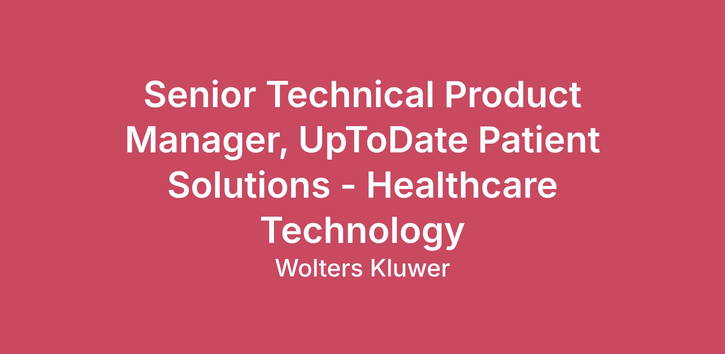 Senior Technical Product Manager, UpToDate Patient SolutionsAt Wolters Kluwer Health, the UpToDate suite helps millions of clinicians and patients make better decisions every day. In this Senior Technical Product Manager role, you will deliver patient engagement and outreach solutions that leverage UpToDate’s evidence-based content, trusted brand, and expanding AI capabilities.Our ideal candidate brings a consumer mindset to healthcare by designing for improving health outcomes – not just functionality. This role drives success for a subset of Patient products by defining horizon-based roadmaps, integrating responsible AI capabilities, and adding value in product enhancements that promote adoption, clinical impact, and revenue.As an individual contributor within the Patient product team, you will partner closely with cross-functional stakeholders to validate problems, design solutions, manage lifecycle, and deliver secure, compliant, and scalable products.Given that these solutions often reach patients through their providers’ technology, you will support diverse forms of delivery (e.g., EMR integrations, API, MCP). In addition, as a lead for a digital outreach product, you will build and test patient-facing campaigns that use AI voice technology and multimodal communications.RESPONSIBILITIES:Product roadmapLead product roadmap for a cohort of Patient products and tools, aligning with customer value, regulatory constraints, and platform and division-level strategy.Identify and deliver AI-enabled capabilities that are anchored to client outcomes (e.g., content acceleration, conversational experiences, workflow automation).Track regulatory, market, and technology trends impacting Patient solutions, proactively assessing product impact and informing roadmap adjustments.Delivery & executionOwn the end-to-end product lifecycle—from opportunity sizing and estimation, to release planning, acceptance, and post-launch iteration.Gather, validate, and translate requirements into clear guidance for product development teams to support timely deployment and adoption.Embed security and compliance into product design and operations (e.g., HIPAA/PHI handling, accessibility, messaging compliance for outreach).Outreach & population health campaignsBuild and test AI-assisted voice and digital outreach campaigns that meet client specifications and compliance requirements.Partner with Customer Success to support successful campaign execution and reporting. Gather client feedback to inform use cases and value drivers.Go-to-market & customer successPartner with Product Marketing, Implementation, and Customer Success to plan launches—from early adopter to general availability—ensuring product readiness.Contribute to product launches and releases by developing documentation, demos, FAQs. For early adopters, deliver client-facing presentations, support onboarding, and gather feedback to inform post-MVP roadmap and product scaling.Leadership & collaborationAct as a product evangelist for UpToDate Patient tools, internally and externally, to drive adoption and value realization.Provide peer leadership and mentoring; elevate product management practices.QUALIFICATIONS:4+ years of product management experience, ideally in healthcare technology, data platforms, or analytics. Strong understanding of data modeling, data integration, and analytics tools. Proven ability to translate technical concepts into business value. Experience with patient engagement solutions, voice and conversational design, accessibility, and/or AI-enabled healthcare solutions is a plus. Excellent communication, collaboration, and stakeholder management skills.Bachelor’s degree in a technical or healthcare-related field; advanced degree preferred. Travel Requirements<10% travel.Our Interview PracticesTo maintain a fair and genuine hiring process, we kindly ask that all candidates participate in interviews without the assistance of AI tools or external prompts. Our interview process is designed to assess your individual skills, experiences, and communication style. We value authenticity and want to ensure we’re getting to know you—not a digital assistant. To help maintain this integrity, we ask to remove virtual backgrounds and include in-person interviews in our hiring process. Please note that use of AI-generated responses or third-party support during interviews will be grounds for disqualification from the recruitment process.Applicants may be required to appear onsite at a Wolters Kluwer office as part of the recruitment process. Compensation:$85,600.00 - $149,400.00 USD This role is eligible for Bonus.Compensation range listed is based on primary location of the position. Actual base salary offer is influenced by a wide array of factors including but not limited to skills, experience and actual hiring location. Your recruiter can share more information about the specific offer for the job location during the hiring process. Additional Information:Wolters Kluwer offers a wide variety of competitive benefits and programs to help meet your needs and balance your work and personal life, including but not limited to: Medical, Dental, & Vision Plans, 401(k), FSA/HSA, Commuter Benefits, Tuition Assistance Plan, Vacation and Sick Time, and Paid Parental Leave. Full details of our benefits are available upon request.