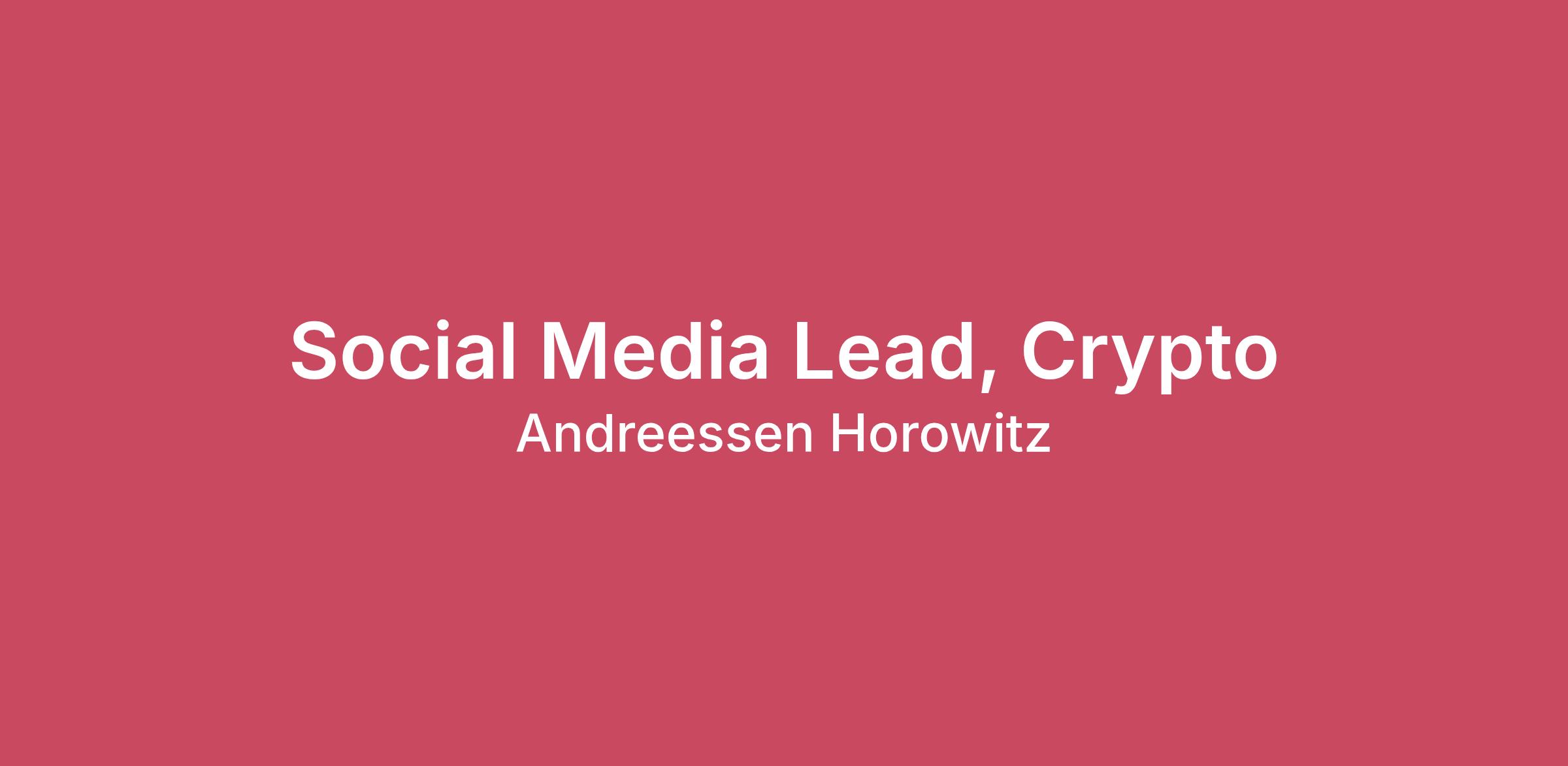 The Social Media Lead is responsible for growing a16z crypto’s social channels, including engaging key communities across different audiences relevant to our industry. They will work closely with the crypto marketing team to (1) adapt and distribute existing content pieces into social media posts; and (2) help create content native to social media: clips, content campaigns, and more. This spans everything from social media for external podcast appearances/ media interviews to investment announcements; to events and major industry conferences; to editorial content; to special projects, campaigns, and more.