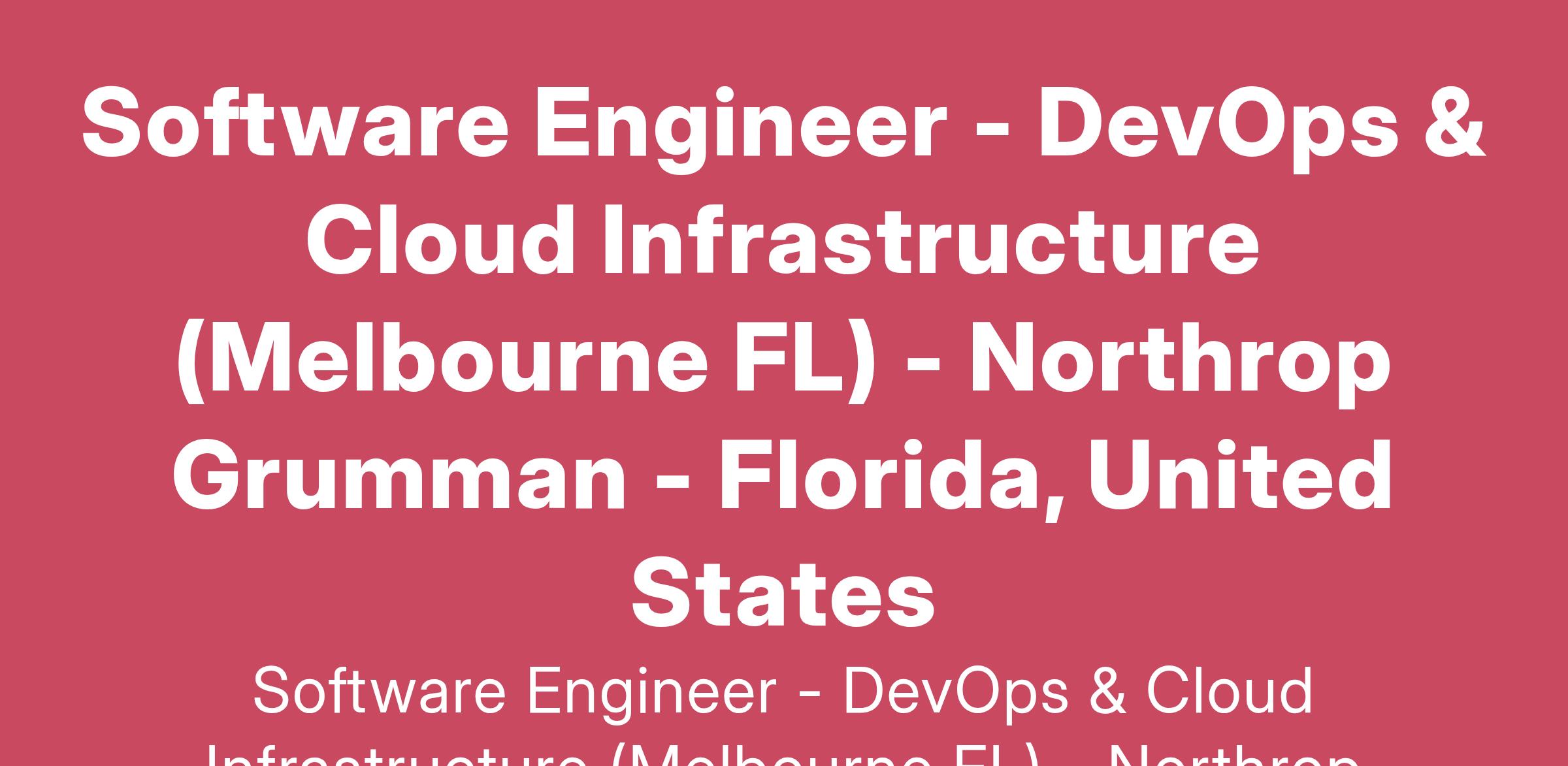 Northrop Grumman Aerospace Systems has an opening for a Engineer Software to join our DevOps and Cloud Infrastructure team of qualified, diverse individuals. This position will be located on-site in Melbourne, Florida.