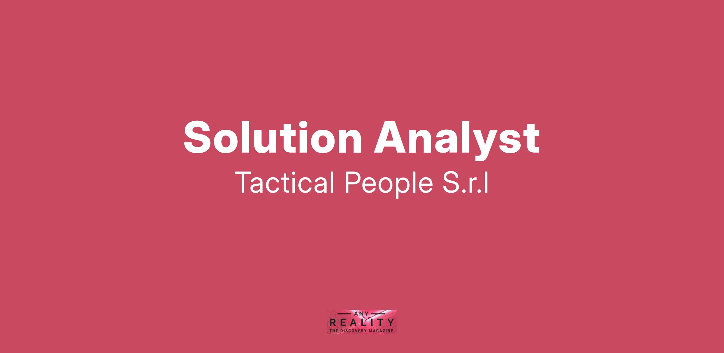 Unisciti a TACTICAL PEOPLE: Innovazione, Persone e Crescita nel Cuore della Digital Transformation Da oltre 20 anni, TACTICAL PEOPLE si posiziona come leader nel mercato ICT, guidando con passione e competenza i nostri clienti di medie e grandi dimensioni attraverso il dinamico percorso della digital transformation. La nostra mission è chiara: non solo abbracciare il cambiamento tecnologico, ma guidarlo, creando soluzioni all'avanguardia che plasmino il futuro digitale. In TACTICAL PEOPLE, crediamo fortemente nel mettere le persone al centro di ogni nostra iniziativa. Le persone sono il cuore pulsante della nostra azienda; il loro benessere, la loro crescita e il loro sviluppo sono la nostra priorità. Ci impegniamo a condividere le strategie aziendali con trasparenza e a fornire formazione e supporto a ogni livello, garantendo che ogni membro del team sia equipaggiato per eccellere e innovare. Stiamo cercando individui che condividano la nostra visione, che siano guidati dalla passione per la tecnologia e che desiderino essere protagonisti nella costruzione di un futuro digitale più luminoso. Se sei pronto a far parte di una squadra che valorizza il talento, incoraggia la crescita personale e professionale e lavora in prima linea nel settore della digital transformation, TACTICAL PEOPLE è il posto giusto per te. Posizione Aperta: Solution Analyst Sede: Remoto Descrizione del Ruolo: Il candidato ideale deve avere almeno 3-5 anni in ruoli analoghi. Cosa offriamo: Inserimento immediato in una Tech Community giovane e dinamica. TACTICAL LEARNING HUB, con corsi di aggiornamento e formazione. Il presente annuncio è rivolto ad entrambi i sessi, ai sensi delle leggi 903/77 e 125/91, e a persone di tutte le età e tutte le nazionalità, ai sensi dei decreti legislativi 215/03 e 216/03. I curricula dovranno pervenire completi di dicitura che autorizza il trattamento dei propri dati: “Si autorizza al trattamento dei dati personali ai sensi del D. Lgs. 196/2003.