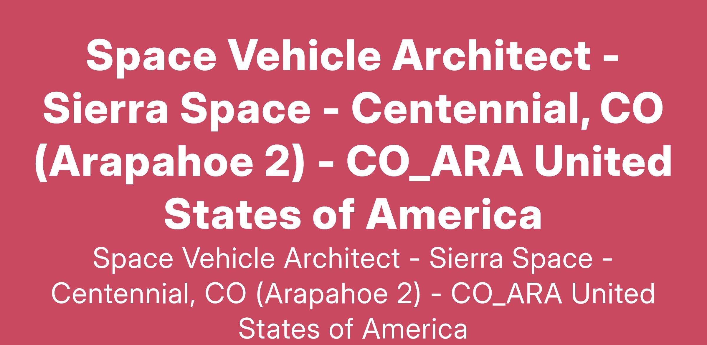 Sierra Space Corporation is an equal opportunity employer and is committed to working with and providing reasonable accommodations to applicants with disabilities. If you need special assistance or a reasonable accommodation related to applying for employment with Sierra Space or at any stage of the recruitment process, please contact us.