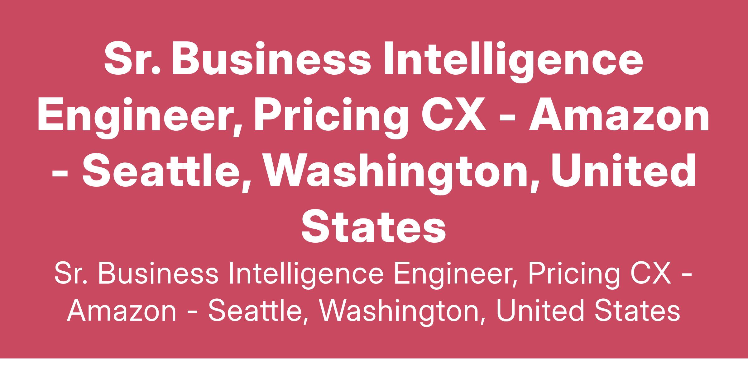 The WW Pricing CX within the Price Perception and Evaluation Org, is looking for a seasoned Senior Business Intelligence Engineer (Sr. BIE) to help us build, report on and analyze metrics for our business, we support all Amazon programs and geographies worldwide.