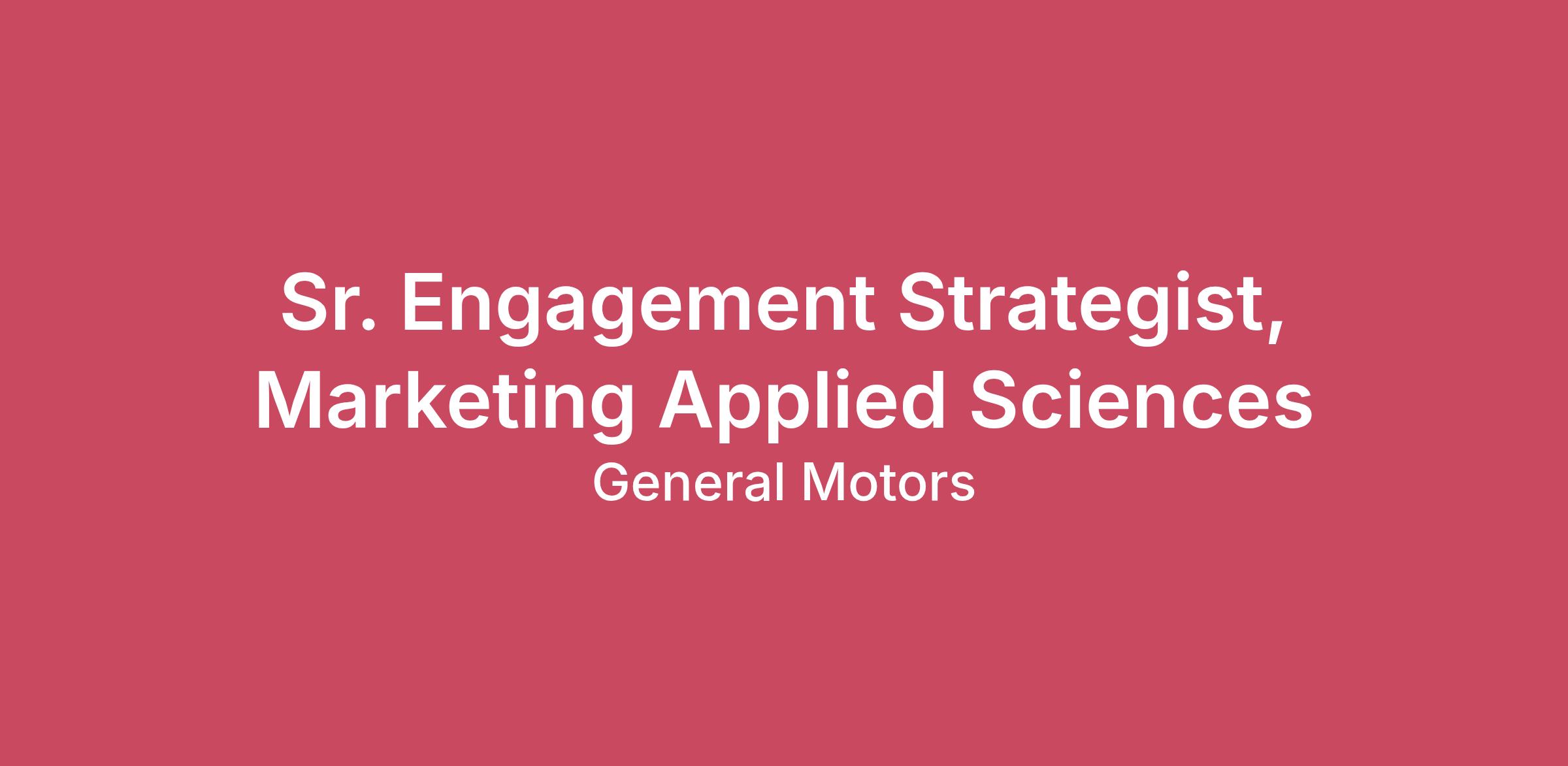 Job DescriptionThe Role The Marketing Applied Sciences (MAS) team is responsible for delivering data-driven solutions to help GM organizations achieve their business goals. The Sr. Engagement Strategist serves as a senior individual contributor and subject matter expert for marketing analytics, helping identify actionable insights across channels and drive ongoing performance optimization efforts. This role is ideal for someone who is hands-on with data, highly collaborative, and skilled at connecting metrics to marketing impact. The Sr. Engagement Strategist also plays a key role in the orchestration of cross-functional initiatives, coordinating with brand, product, and analytics partners to help measure and improve marketing effectiveness across media channels, audiences, websites, etc. The ideal candidate is highly organized and comfortable with managing complex data and analytics projects. They also bring deep expertise in paid media and digital platforms, a passion for solving business problems with data, and the ability to clearly communicate results and concepts to both technical and non-technical audiences. What you'll doServe as a strategic partner to brand and performance marketing teams, gaining a deep understanding of the business, marketing goals, and underlying questions to inform data-driven decision making. Lead end-to-end delivery of campaign performance analyses by connecting paid media, website engagement, audience strategy, and business context into a cohesive narrative. Collaborate with data scientists, product managers, and channel leads to ensure accurate and timely delivery of measurement needs. Use analytics tools (e.g., Databricks, Power BI) to independently explore data, validate findings, and build robust supporting analysis where needed. Build clear, compelling narratives that translate complex data into business relevant insights and actionable recommendations for senior stakeholders. Drive standardization and automation of recurring analyses where appropriate, freeing up time for deeper, more strategic work. Proactively identify performance trends and opportunities for testing and optimization. Contribute to MAS best practices, templates, and frameworks for measurement and communication. Your Skills & Abilities (Required Qualifications) Bachelor’s degree in Marketing, Business Analytics, Statistics, Economics, or related field 6+ years of experience in media/performance marketing analytics or a related role Deep understanding of media performance KPIs, attribution concepts, and audience targeting Strong proficiency with PowerPoint and advanced Excel functions Proficiency with data visualization tools such as Power BI or Tableau Strong analytics thinking with attention to detail and a bias toward action Excellent written and verbal communication skills Abilty to work effectively in a fast-paced, collaborative environment What Will Give You a Competitive Edge (Preferred Qualifications) Proficiency with Databricks (SQL, Python) for querying, analyzing, and manipulating datasets Experience in automotive or consumer product marketing Hands-on experience with Adobe Analytics, Google Analytics, and media measurement platforms Working knowledge of campaign optimization and audience segmentation strategies Understanding of Generative AI prompt design and output validation The salary range for this role is ($106,600 - $163,400). The actual base salary a successful candidate will be offered within this range will vary based on factors relevant to the position. Bonus Potential: An incentive pay program offers payouts based on company performance, job level, and individual performance. Benefits: GM offers a variety of health and wellbeing benefit programs. Benefit options include medical, dental, vision, Health Savings Account, Flexible Spending Accounts, retirement savings plan, sickness and accident benefits, life insurance, paid vacation & holidays, tuition assistance programs, employee assistance program, GM vehicle discounts and more. GM does not provide immigration-related sponsorship for this role. Do not apply for this role if you will need GM immigration sponsorship now or in the future. This includes direct company sponsorship, entry of GM as the immigration employer of record on a government form, and any work authorization requiring a written submission or other immigration support from the company (e.g., H1-B, OPT, STEM OPT, CPT, TN, J-1, etc). This role is categorized as remote. This means the selected candidate may be based anywhere in the country of work and is not expected to report to a GM worksite unless directed by their manager. The selected candidate will be required to travel <25% for this role. About GMOur vision is a world with Zero Crashes, Zero Emissions and Zero Congestion and we embrace the responsibility to lead the change that will make our world better, safer and more equitable for all.Why Join Us We believe we all must make a choice every day – individually and collectively – to drive meaningful change through our words, our deeds and our culture. Every day, we want every employee to feel they belong to one General Motors team.Benefits OverviewFrom day one, we're looking out for your well-being–at work and at home–so you can focus on realizing your ambitions. Learn how GM supports a rewarding career that rewards you personally by visiting Total Rewards resources.Non-Discrimination and Equal Employment Opportunities (U.S.)General Motors is committed to being a workplace that is not only free of unlawful discrimination, but one that genuinely fosters inclusion and belonging. We strongly believe that providing an inclusive workplace creates an environment in which our employees can thrive and develop better products for our customers.All employment decisions are made on a non-discriminatory basis without regard to sex, race, color, national origin, citizenship status, religion, age, disability, pregnancy or maternity status, sexua