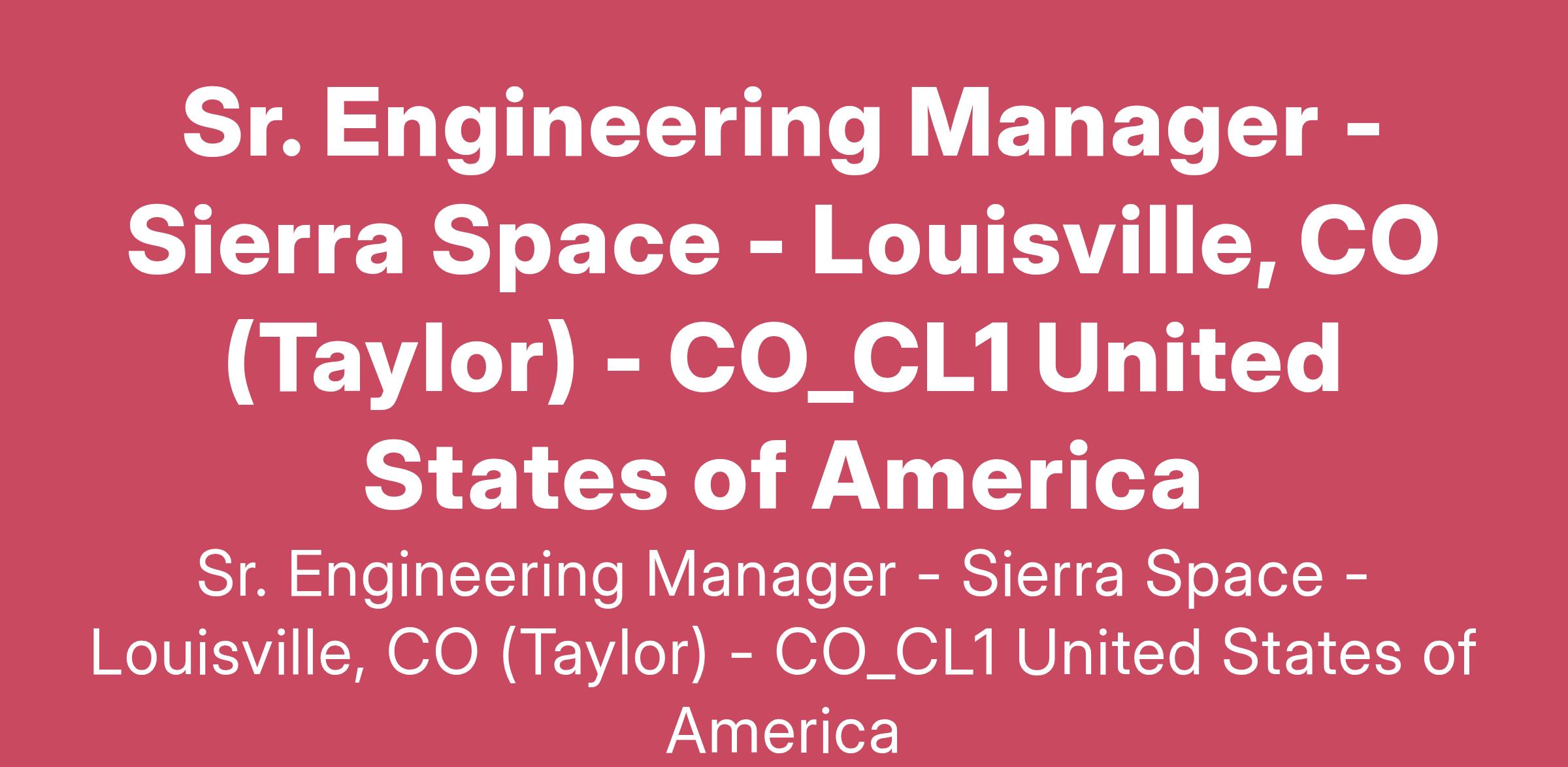 Sierra Space Corporation is an equal opportunity employer and is committed to working with and providing reasonable accommodations to applicants with disabilities. If you need special assistance or a reasonable accommodation related to applying for employment with Sierra Space or at any stage of the recruitment process, please contact us.