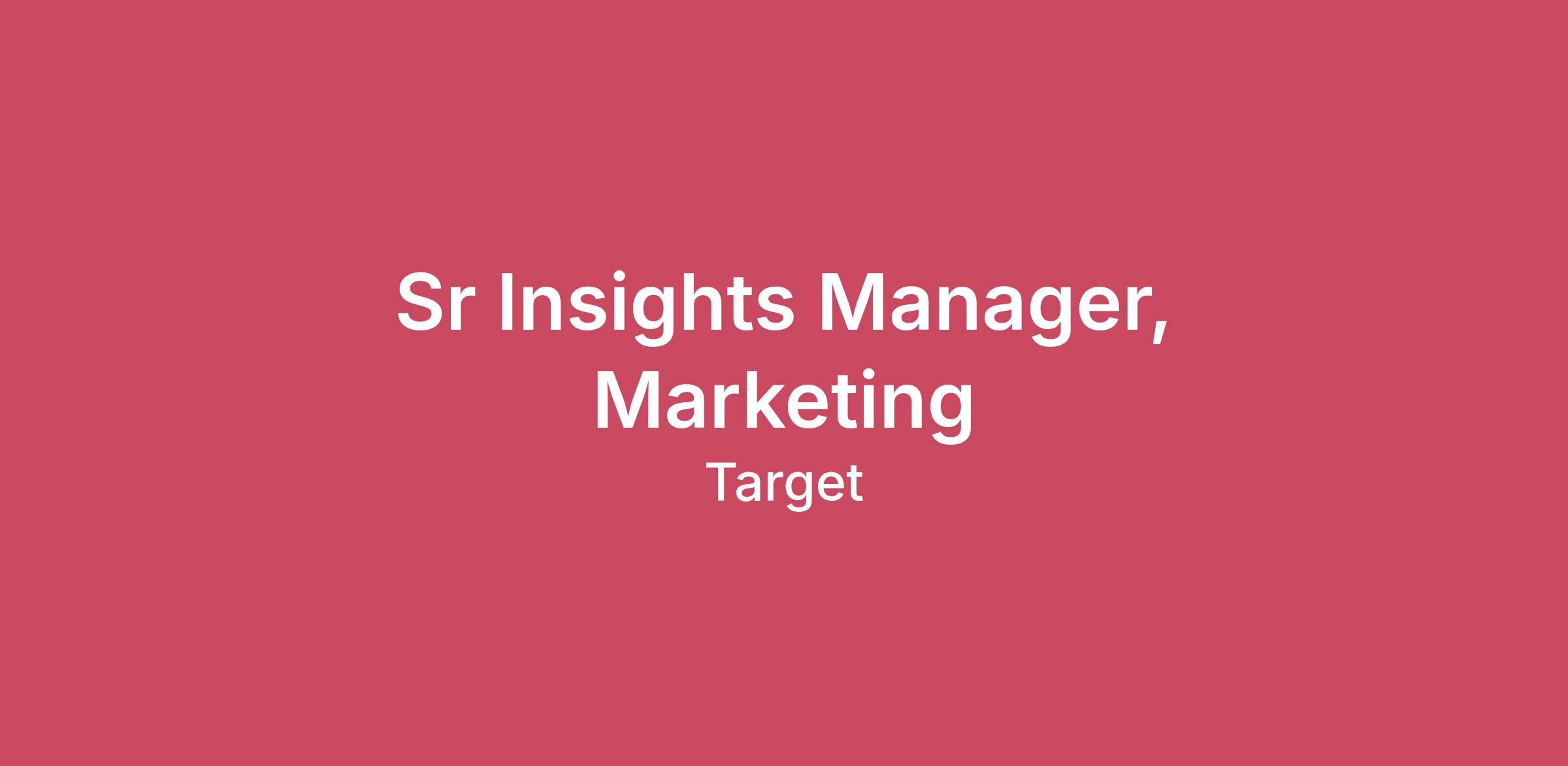 The pay range is $115,000.00 - $206,000.00Pay is based on several factors which vary based on position. These include labor markets and in some instances may include education, work experience and certifications. In addition to your pay, Target cares about and invests in you as a team member, so that you can take care of yourself and your family. Target offers eligible team members and their dependents comprehensive health benefits and programs, which may include medical, vision, dental, life insurance and more, to help you and your family take care of your whole selves. Other benefits for eligible team members include 401(k), employee discount, short term disability, long term disability, paid sick leave, paid national holidays, and paid vacation. Find competitive benefits from financial and education to well-being and beyond at https://corporate.target.com/careers/benefits.Working at Target means helping all families discover the joy of everyday life. We bring that vision to life through our values and culture. Learn more about Target here. A role on the Enterprise Insights team means you will be a champion for our current and future guests, inspiring the organization to act in their best interest. You will help partners build consumer-centric strategies and activations.As a Senior Insights Manager, Marketing Insights, you have responsibility for building Enterprise-wide empathy and understanding of consumers based upon important demographics, behaviors, needs, and attitudes. You will be responsible for designing and executing guest or consumer research to support key initiatives. You will be the primary contact for internal partners and will identify the appropriate research method, data source and vendor/supplier to execute work. Lead the design, execution, and measurement of advertising campaigns across all media channels, ensuring alignment with organizational objectives and delivering insights and strategic recommendations to senior leadership. Core responsibilities of this job are described within this job description. Job duties may change at any time due to business needs. About you:8+ years of consumer insights or market research inclusive of advertising measurement or marketing analytics.Experience working with marketing measurement solutions that include, but not limited to: campaign tracking, creative testing and development, brand lift studies, and experiential measurement; marketing mix modeling and multi-touch attribution modeling a plus.Ability to craft a compelling narrative around data and insights that makes them accessible and persuasive to senior leadership, stakeholders, or cross-functional partners.Evaluating potential risks based on data-driven insights and developing strategies to mitigate those risks.Ability to identify underlying causes of business problems through data and research rather than just surface-level symptoms.Ability to define and track Key Performance Indicators (KPIs) to measure business performance and ensure alignment with strategic goals.Synthesize data from multiple sources (e.g., Nielsen, MRI, SNL Kagan, and internal sources) into clear, compelling narrativesStrong foundational knowledge of qualitative and quantitative research methods and tools, including the ability to diagnose data irregularities.Capable of managing multiple projects simultaneously.Ability to manage external vendors, including market research firms and data providers, ensuring quality and timeliness of projects.This position may be considered for a Remote or Hybrid (known internally at Target as "Flex for Your Day") work arrangement based on Target's needs. A Remote work arrangement means the team member works full-time from home or an alternate location that's not a Target location, does not have a desk at a Target location and may travel to HQ up to 4 times a year. A Hybrid/Flex for Your Day work arrangement means the team member's core role may be performed either remote or onsite at a Target location depending upon what your role, team and tasks require for that day. Work duties cannot be performed outside of the country of the primary work location, unless otherwise prescribed by Target.Benefits EligibilityPlease paste this url into your preferred browser to learn about benefits eligibility for this role: https://tgt.biz/BenefitsForYou_EAmericans with Disabilities Act (ADA)In compliance with state and federal laws, Target will make reasonable accommodations for applicants with disabilities. If a reasonable accommodation is needed to participate in the job application or interview process, please reach out to candidate.accommodations@HRHelp.Target.com. Non-accommodation-related requests, such as application follow-ups or technical issues, will not be addressed through this channel. Application deadline is : 04/01/2026