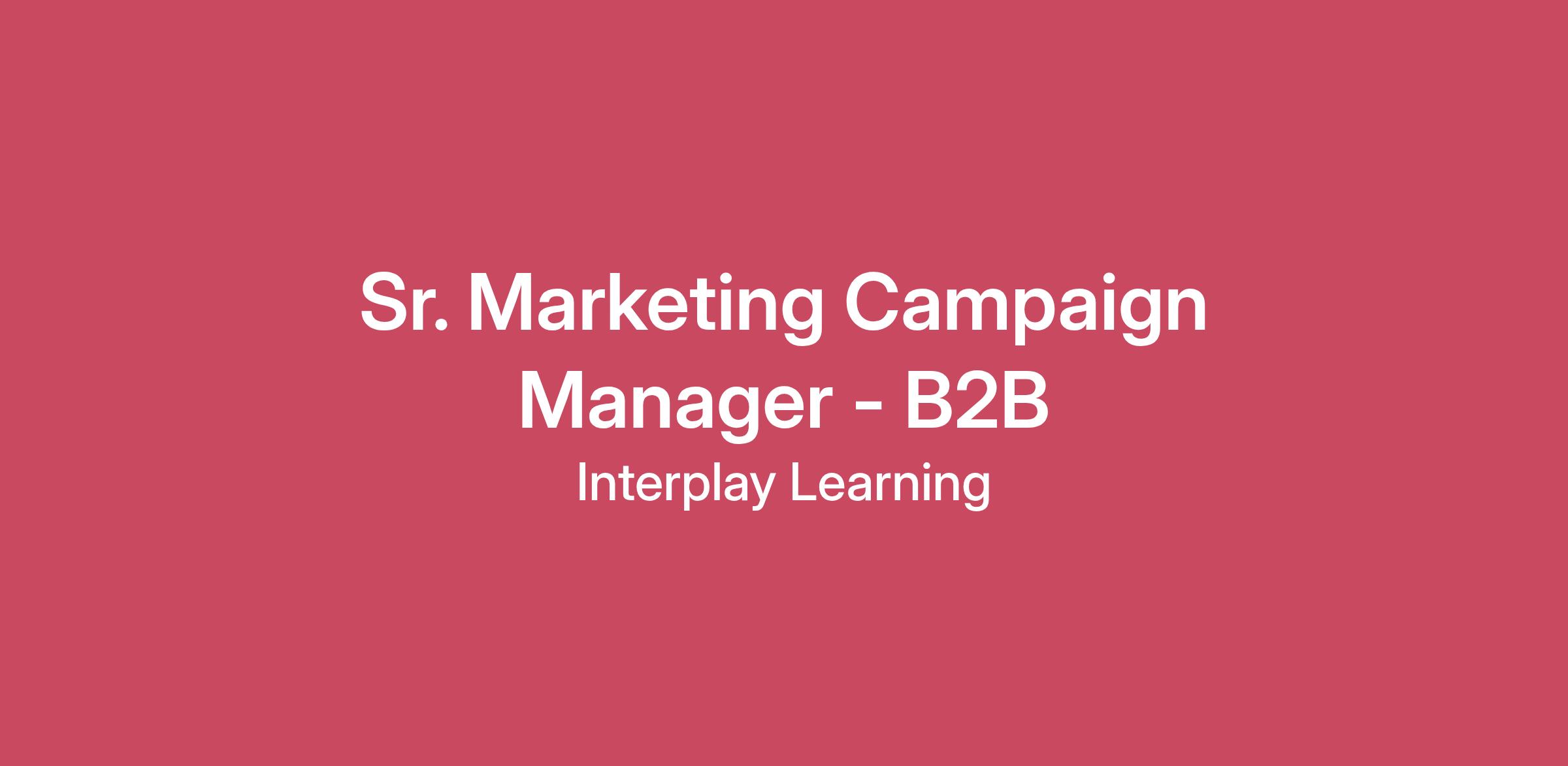 Position: Sr. Marketing Campaign ManagerThe Sr. Marketing Campaign Manager plays a critical role in turning B2B SaaS marketing strategy into high-impact digital execution. Operating in a fast-paced, collaborative environment, this role partners closely with other marketing team members to drive campaign execution & management across paid social, paid advertising, email and organic social. You’ll also be highly operational, working in Hubspot and within our CRM (Salesforce) to manage campaigns and track & report campaign performance. Hands-on and execution-focused, this role blends creativity with operational rigor. The Sr. Marketing Campaign Manager brings exceptional project management skills and cross-functional partnership to ensure smooth coordination and on-time delivery across multiple complex initiatives. Their work directly fuels demand generation, strengthens brand presence, and accelerates pipeline growth.Why this position:Meaningful, impactful workMission-driven companyCareer development in a dynamic, high growth environmentPassionate, collaborative team Innovative product - EdTech, VR, AIWhat you’ll do:Manage campaign execution across multiple channels, including paid search, paid social, display, email, organic social, and content distribution.Analyze performance data and use insights to optimize campaigns in real time, adjusting messaging, channels, and budgets as needed.Strategically allocate budgets across channels to maximize ROI and campaign performance.Vet, select, and manage third-party vendors, agencies, and media partners to ensure cost-effective, high-quality delivery.Who you are:A data-driven team player passionate about building operational excellence.An avid learner energized by experimentation, testing, and continuous improvement.Customer-obsessed and committed to delivering highly engaging, tailored experiences.An optimistic, energetic collaborator who thrives on teamwork and breaking records.Requirements:3+ years of general marketing experience with a B2B SaaS company, targeting a wide range of segments and personas.HubSpot experience strongly preferred (experience with Marketo, Salesforce, Pardot, or ActiveCampaign also transferable)Experience managing paid advertising, paid social, marketing automation, email campaigns, dashboards, marketing reports.Strong writing skills across email, ad copy, and social media content.Ability to operate independently in a fast-moving, start-up environment.Ability to present ideas & reporting and make data-driven decisions.Strong analytical aptitude and comfort working with performance data.Candidates must be authorized to work in the United States for any employer without stipulations and be residents of the United States.Following the offer of employment, all roles will require a background check and a drug and alcohol test. Some positions may require other verifications, such as, driver eligibility and record, credentials or education. All new hires will be required to complete the I-9 Form and E-verify process upon employment. Pay: $125,000-$140,000 (based on experience). This position is not eligible for a bonus. Benefit & Perks - why you'll love working with us:Remote-first & flexible hours – Offices in Austin, TX; Deer Park, TX; Woodland, WA; and Cleveland, OH.Learning & growth – Annual learning reimbursement.Family-friendly policies – Support for work-life balance.Generous time off – 3 weeks PTO, 1 week Winter Break, holidays, and sick days.Comprehensive benefits – Medical, vision, dental, and 401(k) match.Equity – Private Company Equity Options Wellness – Mental and physical health resources and social events.Join us and grow with a team that values you! Equal Employment OpportunityInterplay Learning is committed to providing equal employment opportunity (EEO) to all qualified employees and applicants for employment without regard to race, color, religion, gender, sexual orientation, national origin, age, disability, pregnancy, marital status, gender identity or expression, status as a veteran, or any other legally protected characteristic or activity in accordance with applicable federal, state and local laws.As a federal contractor, Interplay Learning takes affirmative action to consider qualified individuals without regard for disability and protected veterans status.Individuals with disabilities who need assistance with the application or recruitment process must promptly contact the HR Department to discuss their particular needs.Interplay Learning does not discriminate against employees or applicants for discussing, disclosing, or inquiring about compensation.Drug Testing & Background TestingThe company conducts background checks as part of the hiring process after extending an offer of employment. These screenings are facilitated by trusted third-party specialists. All positions require I-9 verification, E-Verify, a background check, and a drug and alcohol screening. Depending on the role, additional screenings may include employment history verification, a DMV record check, reference checks, education and credential verification, or a credit history review.We believe in fostering a welcoming and inclusive workplace and encourage everyone to apply, regardless of background. Our hiring decisions are guided by skills, experience, and a shared commitment to our values. If you have any questions about our process, we’re happy to provide support and guidance along the way.