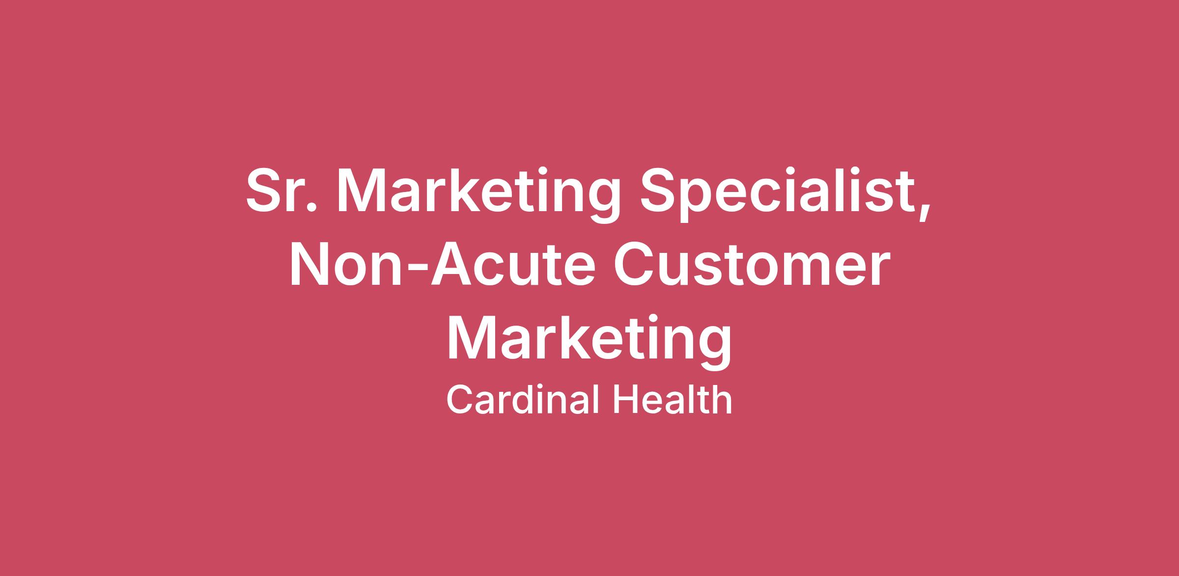 Headquartered in Dublin, OH, Cardinal Health is a global healthcare services and products company. We provide customized solutions for hospitals, healthcare systems, pharmacies, ambulatory surgery centers, clinical laboratories, physician offices and patients in the home. We are a distributor of pharmaceuticals and specialty products; a global manufacturer and distributor of medical and laboratory products; an operator of nuclear pharmacies and manufacturing facilities; and a provider of performance and data solutions. Working to be healthcare’s most trusted partner, our customer-centric focus drives continuous improvement and leads to innovative solutions that improve the lives of people every day.Cardinal Health’s US Medical Products and Distribution (“USMPD”) business offers industry expertise and an expanding portfolio of safe, effective medical products that improve quality, manage costs and reduce complexity. With our trusted regulatory experience, insights, and infrastructure, we help manufacture and source medical products that meet the demand for value-driven, comprehensive healthcare solutions.Channel Marketing is responsible for anchoring into the customer and defining our integrated value proposition that connects distribution, products, and services. Channel Marketing ensures that our go-to-market strategy is grounded in customer needs while optimizing how our offerings are positioned and delivered through each channel. It defines the customer roadmap and guides cross-functional teams to ensure alignment between customer insights, market opportunities, and commercial execution.The Sr. Marketing Specialist, Non-Acute Customer Marketing, plays a critical role in supporting marketing strategy within the Cardinal Health Ambulatory Surgery Center and Physician Office businesses, carrying out tactics necessary to achieve growth goals.ResponsibilitiesBecome a distribution expert and develop a strong understanding of non-acute marketsAbility to take initiative to drive projects to completion and prioritize competing deadlines as neededSupport team members with tactical needs to manage the day-to-day businessServe as the primary point of contact for sales support to help the business achieve annual revenue goalsUnderstand end customer clinical practice & patient needs as well as US market trendsDemonstrate strong financial acumen and logical decision making in the general business environmentDevelop strong relationships to collaborate cross functionally including but not limited to Sales, Finance, Product Marketing, Medical/Clinical Affairs, Strategic Pricing, LegalSupport critical revenue driving projects and effectively communicate project progressQualifications2-4 years of experience, preferredBachelor's degree in related field, or equivalent work experience, preferredAnalytical Thinking: Ability to interpret data, pull metrics, and make data-driven decisions.Communication & Storytelling: Strong written and verbal communication to create compelling messaging.Market Research: Experience in researching and understanding customer pain points.Project Management: Ability to manage multiple projects simultaneously and establish priorities.Cross-functional Collaboration: Skill in working across teams including Operations, Sales, and Marketing.Location: This position can be remote and based anywhere within the United States. Candidates must be able to work within EST or CST business hours.Anticipated salary range: $68,500 - $78,200Bonus eligible: NoBenefits: Cardinal Health offers a wide variety of benefits and programs to support health and well-being.Medical, dental and vision coveragePaid time off planHealth savings account (HSA)401k savings planAccess to wages before pay day with myFlexPayFlexible spending accounts (FSAs)Short- and long-term disability coverageWork-Life resourcesPaid parental leaveHealthy lifestyle programsApplication window anticipated to close: 04/06/26 *if interested in opportunity, please submit application as soon as possible.** The salary range listed is an estimate. Pay at Cardinal Health is determined by multiple factors including, but not limited to, a candidate’s geographical location, relevant education, experience and skills and an evaluation of internal pay equity.Candidates who are back-to-work, people with disabilities, without a college degree, and Veterans are encouraged to apply. Cardinal Health supports an inclusive workplace that values diversity of thought, experience and background. We celebrate the power of our differences to create better solutions for our customers by ensuring employees can be their authentic selves each day. Cardinal Health is an Equal Opportunity/Affirmative Action employer. All qualified applicants will receive consideration for employment without regard to race, religion, color, national origin, ancestry, age, physical or mental disability, sex, sexual orientation, gender identity/expression, pregnancy, veteran status, marital status, creed, status with regard to public assistance, genetic status or any other status protected by federal, state or local law.To read and review this privacy notice click here