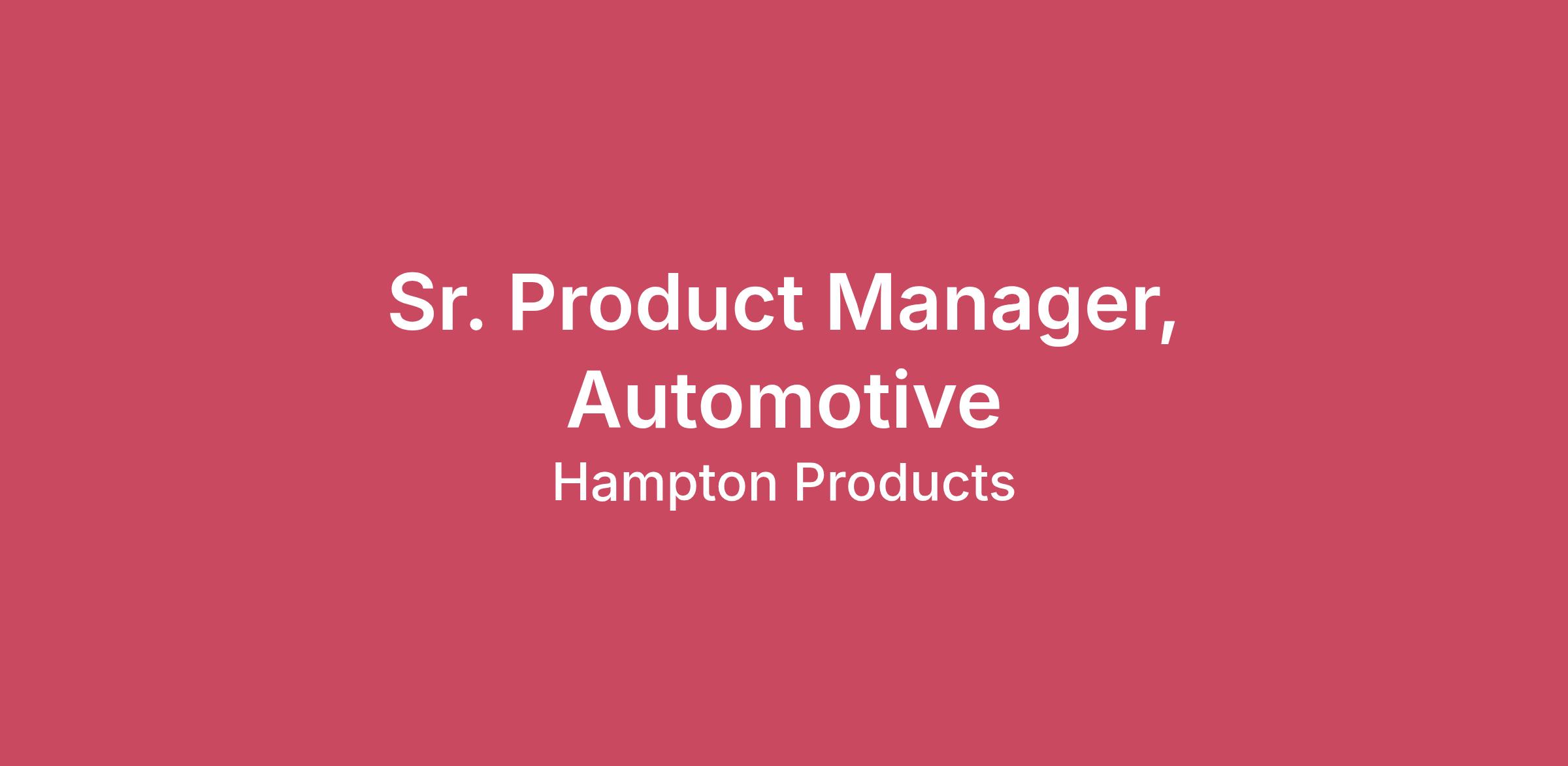 We are looking for a full-time, experienced and self-motivated Sr. Product Manager, Automotive to join our Marketing Team to lead the design, implementation and monitoring of business programs and initiatives to support business segment growth.Hampton Products is a leading North American provider of both residential and commercial security and door hardware, builder’s hardware, cargo management, and portable security products. Founded in 1973, Hampton Products provides industry-leading customer service and retail metrics. Hampton’s products are available in major retail stores in North America under the Brinks, Keeper, Universal Hardware and Wright Products brands. For more information, please visit https://www.hamptonproducts.com/. Essential Duties and Responsibilities:Acts as the subject matter expert on towing and trailer categories such as, but not limited to structural hardware, coupling and connection components, electrical, braking, and towing safety and performance.Supports and executes segment growth strategies in collaboration with Finance, Sales, Global Supply, R&D, and all other functional areas.Responsible for leading brand, channel and product marketing initiatives in support of the overall segment strategic plan. Conducts research and analysis on gaps in the towing and trailer market for safety, ease of use, and connectivity.Maintains working knowledge on material finishes and compositions, and how they withstand everyday and extreme usage or conditions.Leads detailed project execution (project management) for new product development and introduction working collaboratively with engineering, sales and supply chain associatesEnsures achievement of key milestones in project execution including product launch date, margin, and sales goalsPerforms consumer research to gain insights into key value proposition drivers for towing and trailer solutions, while researching opportunities for new and innovative solutions. Conducts field research observing customer usage and identifying product failures and safety risks. Understand all standards and compliance aligned with the category.Executes projects and key initiatives within targeted budget for sales, margin, direct costs for the assigned segment/line of business.Analyzes and manages revenue, cost, and margin for segment/line of business.Manages product innovation and project prioritization efforts.Ensures that marketing and promotional strategies align with public relations.The successful candidate will have the following:Four-year college or university program certificate in marketing, business, or related discipline; and no less than 10 years of progressive management experience in marketing; or equivalent combination of education and experience.At least 10 years of experience in the consumer goods industry with a mechanical aptitude and literacy in the towing and trailer market.Master’s degree in business or marketing is preferred.Have a mechanical aptitude and literacy in the towing and trailer market.Solid project management experience related to new product introduction and a NPI milestone process.Outstanding interpersonal skills with the ability to organize and lead cross functional teams to execute initiatives for new products, programs, trade, and promotional events. Don’t let this job get away. Many feel that Hampton Products is a special place to work, and our core values are the primary reasons for that feeling. These core values (Inspiration, Caring and Innovation) are the soul of our company, and they are what set us apart. If this resonates with you, here’s your chance to work for an outstanding company that really cares about its employees as well as its customers. If you are interested, please apply here: Hampton Products International Corporation is an equal employment opportunity employer.