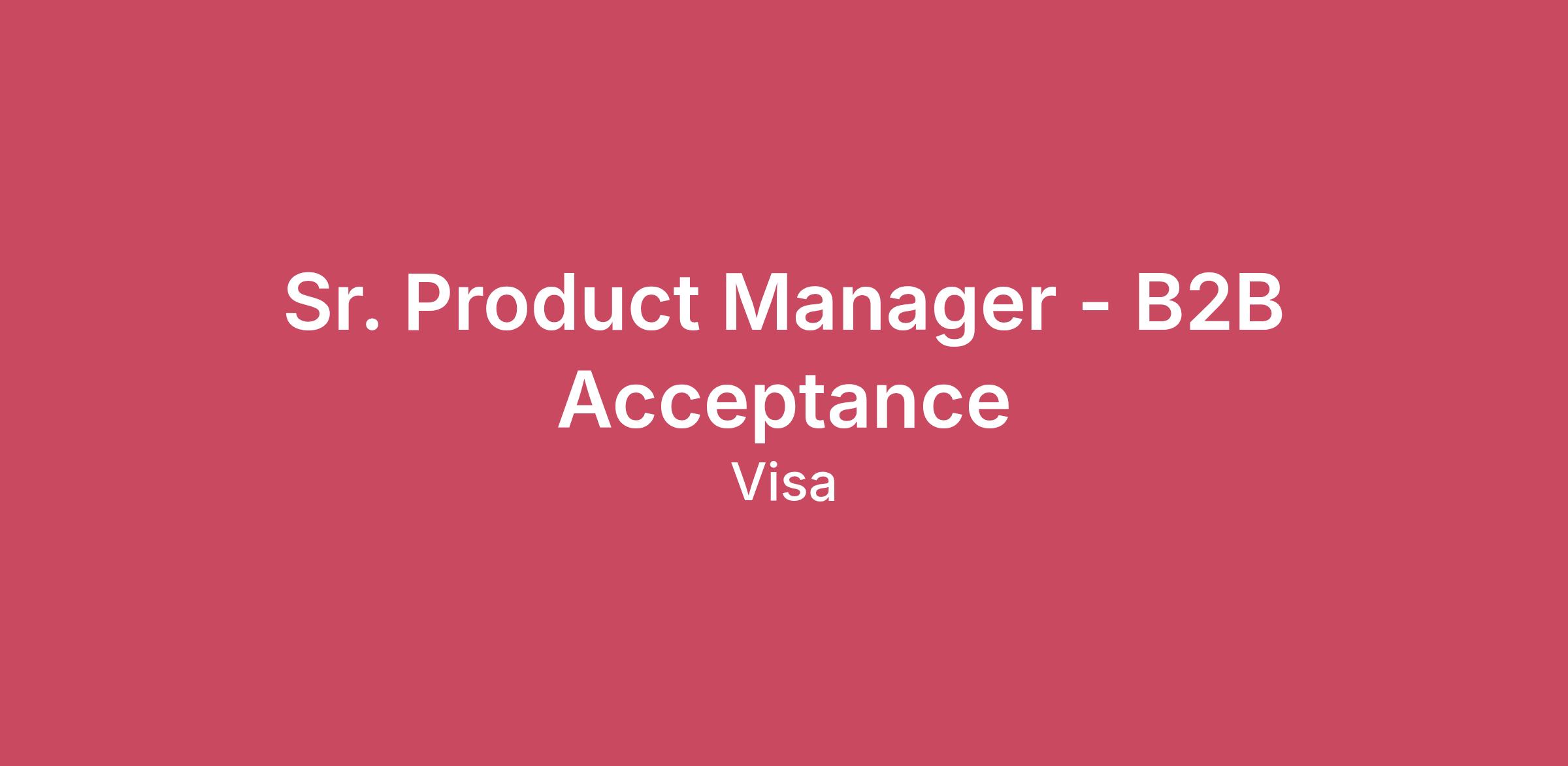 Company DescriptionVisa is a world leader in payments technology, facilitating transactions between consumers, merchants, financial institutions and government entities across more than 200 countries and territories, dedicated to uplifting everyone, everywhere by being the best way to pay and be paid.At Visa, you'll have the opportunity to create impact at scale — tackling meaningful challenges, growing your skills and seeing your contributions impact lives around the world. Join Visa and do work that matters — to you, to your community, and to the world.Progress starts with you.Job DescriptionResponsibilities:Lead comprehensive review of Visa’s Acceptance offerings and their competitive positioning against alternative solutions in-market.Develop and lead go-to-market activities in partnership with client-facing teams to grow adoption of Visa B2B Acceptance products in both the United States and Canada.Standardize Visa’s B2B Acceptance products across the United States and Canada, with recognition of the regional differences across geographies.Analyze, comprehend and assess the scope of the B2B Acceptance trends within the US Business and Commercial issuer portfolios.Understand and maintain a deep understanding of the commercial payment landscape, with a focus on the acceptance side.Provide subject matter expertise to external partners at the issuing banks, issuing processors, merchants, and merchant acquirers and develop and implement a complete plan for growing adoption of Visa’s suite of B2B acceptance offerings.Provide SME-level support to teams engaged with B2B acceptance in both the United States and Canada.Maintain monitoring system to track key B2B Acceptance metrics that augment engagement efforts.Provide statistical analysis on portfolio performance trending.Provide status updates to stakeholders at all levels with applicable detail based on the targeted audience.Secondary Job Responsibilities:The candidate will interact with various stakeholders across the organization as well as with external clients and will have close working relationship with our Global B2B Acceptance team.Strong leadership and interpersonal skills are required as cross-functional projects occur on a regular basis.Must demonstrate well-developed interpersonal, organizational, and communication skills.Collaborates easily and successfully with varying levels of stakeholders and management in a matrix organization structure.Operates with minimal supervision and able to make informed, well-reasoned decisions independently.Thrives on an environment that is fast paced, rapidly changing, and customer focused.This position is available at our Visa offices, preferred in San Francisco, CA.This is a hybrid position. Expectation of days in office will be confirmed by your hiring manager.QualificationsBasic Qualifications:8 or more years of relevant work experience with a Bachelor Degree or at least 5 years of experience with an Advanced Degree (e.g. Masters, MBA, JD, MD) or 2 years of work experience with a PhD Preferred Qualifications:9 or more years of relevant work experience with a Bachelor Degree or 7 or more relevant years of experience with an Advanced Degree (e.g. Masters, MBA, JD, MD) or 3 or more years of experience with a PhDProven experience in launching new solutions and solving business problems for client entitiesExperienced with online and digital products that support Commercial Cards, ACH, Real-Time Payments, Cross-Border Payments and/or other emerging payments railsProven experience in all aspects of product management and the ability to lead strategic to tactical discussions as well as bridge business and technical teamsDeep understanding of payment systems (card networks, ACH, RTP, digital wallets)Experience with payment network, banks, payment processors or financial technology software providers is a plusStrong analytical skills with experience conducting data research, developing hypotheses based on unstructured data, validate the hypothesis, and provide recommendationsEffective communication skills, storytelling, strong presentation skills, executive presence, and ability to explain complex business and technical concepts to broad audiences and C-suite individuals in an engaging wayDetail oriented and highly execution focused by working in conjunction with various counterparts across multiple functional groupsExcellent collaboration skills and ability to work internally across business, technology, and delivery teams, and externally with clients and other stakeholdersAbility to quickly learn about the internal Visa solutions, processes, culture, leadership principles and how it all works together and embrace changes in an ecosystem that is rapidly evolvingAbility to manage, and coordinate across complex cross-functional teams including technical and non-technical resourcesStrong results-oriented contributor, analytic and fact-based consultative discipline demonstrating a growth mindsetAdds value to customers by insightful and thoughtful questioning, offering new ideas, and delivering solutionsTeam oriented, collaborative, diplomatic, and flexibleAdditional InformationWork Hours: Varies upon the needs of the department.Travel Requirements: This position requires travel 5-10% of the time.Mental/Physical Requirements: This position will be performed in an office setting. The position will require the incumbent to sit and stand at a desk, communicate in person and by telephone, frequently operate standard office equipment, such as telephones and computers.Visa is an EEO Employer. Qualified applicants will receive consideration for employment without regard to race, color, religion, sex, national origin, sexual orientation, gender identity, disability or protected veteran status. Visa will also consider for employment qualified applicants with criminal histories in a manner consistent with EEOC guidelines and applicable local law.Visa will consider for employment qualified applicants with