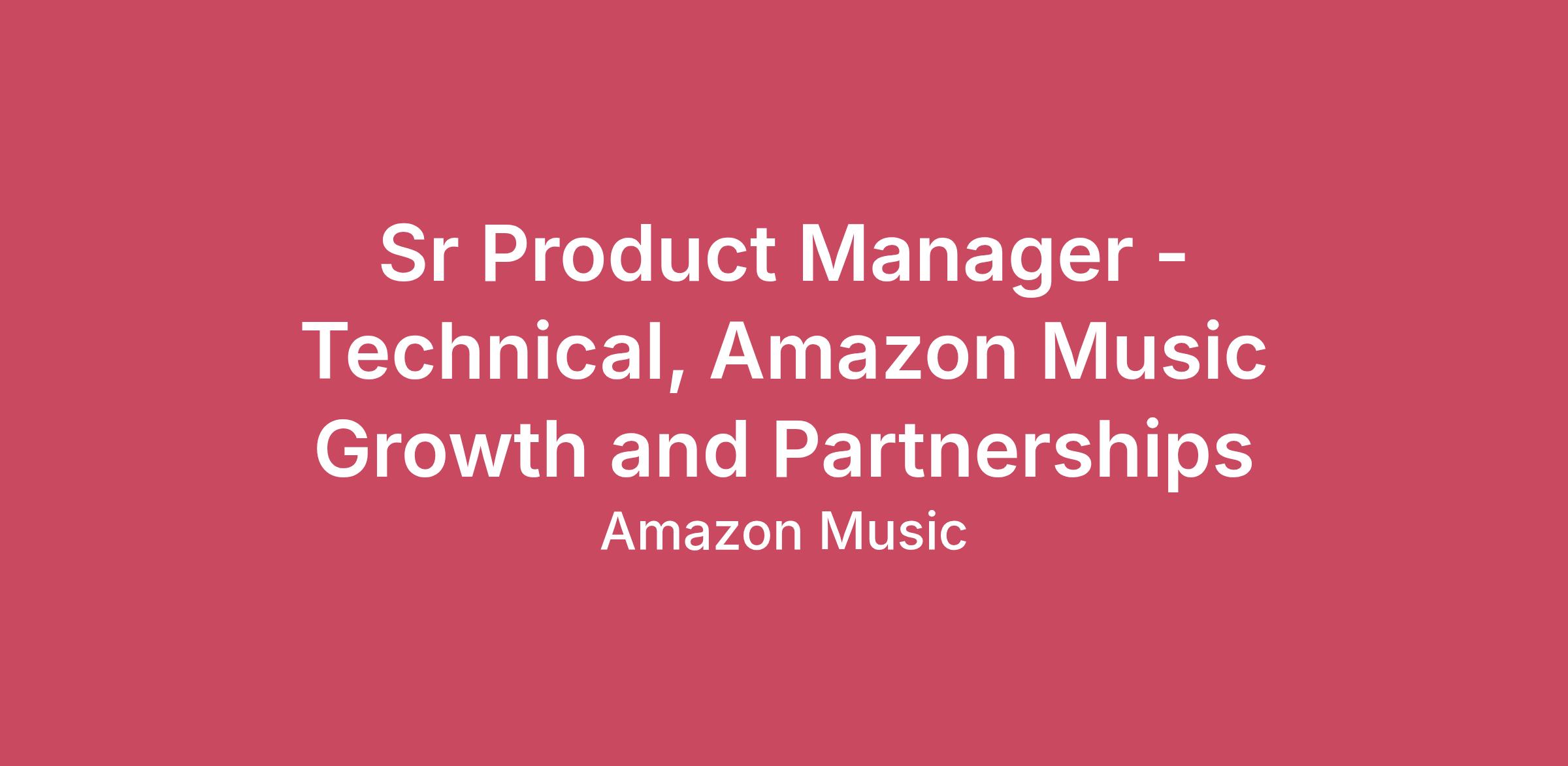 Amazon Music is an immersive audio entertainment service that deepens connections between fans, artists, and creators. From personalized music playlists to exclusive podcasts, concert livestreams to artist merch, Amazon Music is innovating at some of the most exciting intersections of music and culture. We offer experiences that serve all listeners with our different tiers of service: Prime members get access to all the music in shuffle mode, and top ad-free podcasts, included with their membership; customers can upgrade to Amazon Music Unlimited for unlimited, on-demand access to 100 million songs, including millions in HD, Ultra HD, and spatial audio; and anyone can listen for free by downloading the Amazon Music app or via Alexa-enabled devices. Join us for the opportunity to influence how Amazon Music engages fans, artists, and creators on a global scale. Learn more at https://www.amazon.com/music.We are on a mission to be the most immersive audio-first entertainment service, connecting customers, artists, and creators through music, stories, culture, and community. As part of Amazon's broader entertainment ecosystem, we are transforming how customers discover and engage with music across every surface—from cars and TVs to mobile devices, wearables, and emerging AI platforms.We are seeking a Senior Product Manager - Technical who is passionate about building products with a strong emphasis on design, quality, performance, and customer satisfaction. This individual will lead product development for our third-party partner integrations, driving end-to-end product strategy and execution across software platforms, APIs, and partner integrations to drive growth for Amazon Music through acquisition, engagement, and retention experiences.The ideal candidate will be highly analytical, resourceful, customer-focused, team-oriented, and able to execute at high velocity under tight deadlines. You'll have a proven track record of end-to-end ownership and delivering results in a fast-paced, dynamic environment. This role is inherently cross-functional—you'll work closely with engineering, product/program management, business development, solution architects, design, operations, marketing, and executive teams across Amazon Music to:- Own end-to-end product delivery from BRD through execution and launch- Partner with business development to develop and launch new high-value integration- Improve existing products and featuresYou will be expected to work backwards from customers, prioritize their needs, and demonstrate strong technical understanding, excellent project management skills, and the motivation to achieve results in a fast-paced environment. You will be a champion for your product and can clearly articulate its value and potential. Successful candidates will have a strong background in Product Management and have a track record of functioning well in a high growth and highly ambiguous environment within a nascent business. They will be data driven, excellent at written and verbal communication, able to build relationships across diverse teams and have excellent problem-solving abilities.Key job responsibilitiesKey Job Responsibilities- Lead end-to-end product delivery for partner integration products across ticketing, Gen AI, automotive, big screen, mobile, and wearables—from BRD through execution and launch- Develop product strategy and roadmap supported by internal and external analysis, with clear ROI, business impact, and post-launch iteration plans- Drive cross-functional alignment and execution across Business Development, Solution Architects, Engineering, Marketing, Finance, Operations, and partner organizations—as well as product and tech teams across Amazon Music (including app, auto, and big screen)—to deliver results through influence without direct authority- Define detailed business requirements and manage prioritization by developing crisp user stories, product specifications, and balancing trade-offs among customer feedback, performance, operational support, and platform investments- Contribute to technical decisions around API design, system architecture, and integration patterns while partnering with Business Development to develop and launch new high-value integrations- Mentor and coach junior team members to elevate the team's product thinking, execution capabilities, and technical depthA day in the lifeYou will own the product lifecycle end-to-end—from discovery and requirements through launch and post-launch iteration—and anticipate customer needs to plan for future features and improvements. Working with a team tasked with driving growth and operating across multiple verticals (Auto, Big Screen, Mobile, Ticketing, Gen AI), you'll quickly adapt to new developments, advocate for customer experience while balancing partner urgency with platform leverage and invent and simplify as we take on ambitious growth goals for our organization!About the teamAt Amazon Music Growth and Partnerships, we are on a mission to reach and delight customers through strategic partnerships that complement first-party distribution. As part of Amazon Music's Business Development organization, we build the platforms, APIs, and partner experiences that enable Amazon Music to be available on any device, in any car, via any surface, and in every relevant moment of customers' daily lives. Our team operates at the intersection of partner urgency and platform leverage—when we get this right, every launch makes the next one easier, faster, and higher quality. As a senior member of the team, you'll also play a key role in mentoring and coaching junior team members, helping to elevate the team's product thinking and execution capabilities- Bachelor's degree- 2+ years of end to end product delivery experience- 5+ years of technical product or program management experience- Experience contributing to engineering discussions around technology decisions and strategy related to a product- Exper