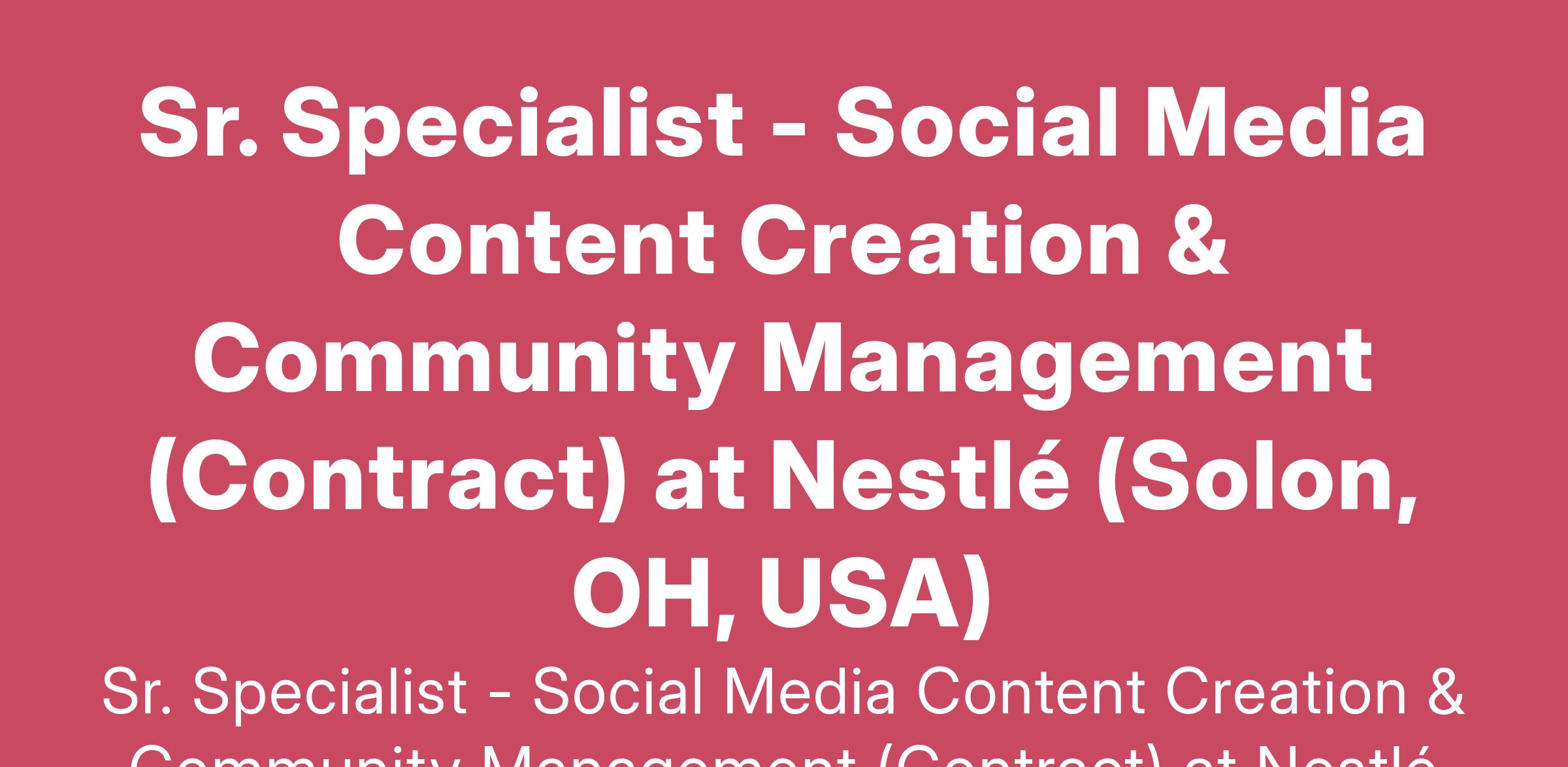 Sr. Specialist - Social Media Content Creation & Community Management (Contract) at Nestlé (Solon, OH, USA)