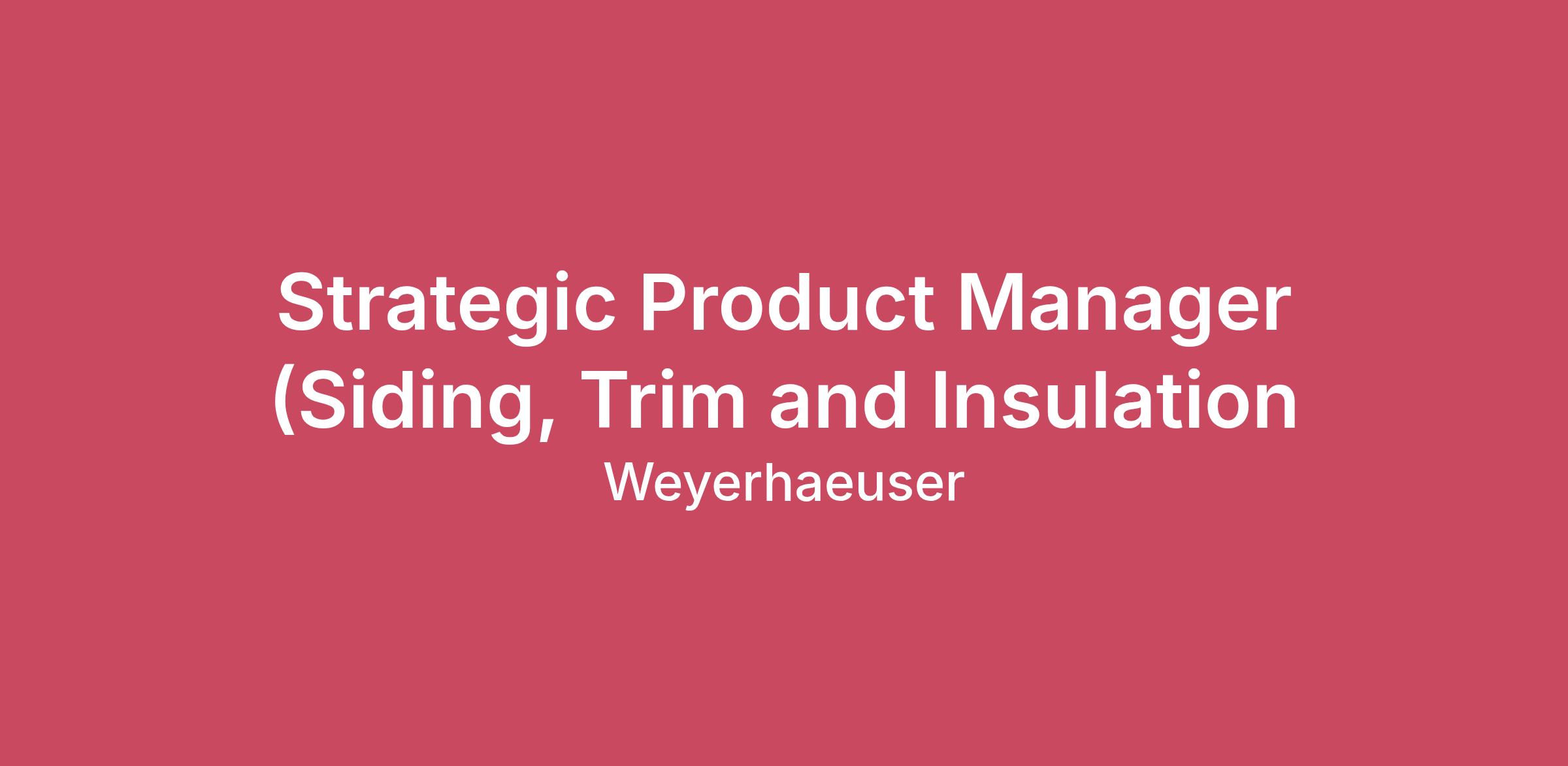 Bachelor’s Degree in relevant field of study10+ years of experience in building products industry5+ years managing strategic relationships (supplier or customer) at the division/region or enterprise level5+ years of large account buying and/or selling experienceDeep and wide experience with siding and insulation suppliers and marketsStrong business acumenExcellent communicator and proven relationship builderStrong analytical abilities to find and utilize vendor, customer, and market-related data to identify opportunities and solve problemsPreferred Qualifications:Prior national product management experience for a manufacturer or distributor a strong plusPeople management experience a plusCore Values:Consistent with our company core values\: Safety, Integrity, Citizenship, Sustainability, and InclusionKey Behaviors:Acts with urgency, accountable, courageous, keeps it simple, driven to innovate in process and approach We sustainably manage forests and manufacture products that make the world a better place. We’re serious about safety, driven to achieve excellence, and proud of what we do. With multiple business lines in locations across North America, we offer a range of exciting career opportunities for smart, talented people who are passionate about making a difference. What We Offer: Compensation\: This role is eligible for our annual merit-increase program, and we are targeting a salary range of $131,000 - $196,000 based on your level of skills, qualifications and experience. You will also be eligible for our Annual Incentive Program, which offers a cash bonus targeting 20% of base pay. Potential plan funding may range from zero to two times that target.Benefits\: When you join our team, you and your dependents will be offered coverage under our comprehensive employee benefits plan, which includes medical, dental, vision, short and long-term disability, and life insurance. We offer a pre-tax Health Savings Account option which includes a company contribution. Other benefit options are also available such as voluntary Long-Term Care and Employee Assistance Programs. We also support personal volunteerism, sponsor a host of diversity networks, promote mentoring, and provide training and development opportunities to help you chart your path to a fulfilling career. Retirement\: Employees are able to enroll in our company’s 401k plan, which includes a paid company match in addition to our contribution equal to 5% of your eligible pay.Paid Time Off or Vacation\: We provide eligible employees who are scheduled to work 25 hours or more per week with 3-weeks of paid vacation to use during your first year of employment. We also recognize eleven paid holidays per year, providing a total of 88 holiday hours and paid parental leave for all full-time employees.For more than a century, we’ve been building our reputation as a leader in sustainable wood products.We've been delivering quality building products and solutions to our customers for more than 100 years. From builders and dealers to specifiers and homeowners, we offer exceptional product performance and unparalleled support.We know you have a choice in your career. We want you to choose us. Weyerhaeuser is an equal opportunity employer. Inclusion is one of our five core values and we strive to maintain a culture where all our people feel a sense of belonging, opportunity and shared purpose. We are committed to recruiting a diverse workforce and supporting an equitable and inclusive environment that inspires people of all backgrounds to join, stay and thrive with our team. Weyerhaeuser Distribution is seeking a National Strategic Product Manager for Siding, Trim and Insulation products. Reporting to the Director of Product Management, this role manages internal and third-party Siding, Trim and Insulation products across our Distribution business. The Strategic Product Manager will develop a comprehensive strategic plan, secure support from vendors, distribution centers, and the sales team, and deliver value to customers nationwide. Role Overview:The Strategic Product Manager works directly with key suppliers and site managers to steward profitable growth for the business.Location:Position is located within commuting distance of a Weyerhaeuser distribution location and related service market - https\://www.weyerhaeuser.com/woodproducts/distribution/Responsibilities:Profitably manage and grow assigned product categoriesDevelop a concise strategic plan focused on vendors, sites, and customers, with an emphasis on expanding the product lines.Maintain and grow strong regional and national supplier relationshipsIdentify and evaluate potential suppliers, new markets, new product opportunities, and competitorsCoordinate interaction between assigned suppliers and other departmentsMaintain distributor and incentive agreements with selected suppliersInitiate and implement product training applicable to your categoriesReview performance of assigned suppliers; implement action plans for improvementDevelop annual marketing plan incorporating vendor, division, and product promotionsWilling to travel 25–35% of the time to company, vendor, and customer locations across the US and Canada In Distribution, we have over 48,000 SKUs from over 300 suppliers of structural framing materials and specialty building products for residential, multi-family and light commercial markets. Our team of on-the-ground sales and support has the industry reach, experience, and knowledge to help grow your business. We’ll get you what you need, when you need it. Our experienced operations team with over 40 LEAN greenbelts provides a safe and efficient delivery service.Find out more about Weyerhaeuser at www.weyerhaeuser.com and learn our Story here\: https\://youtu.be/c2R_lQ7wo0A