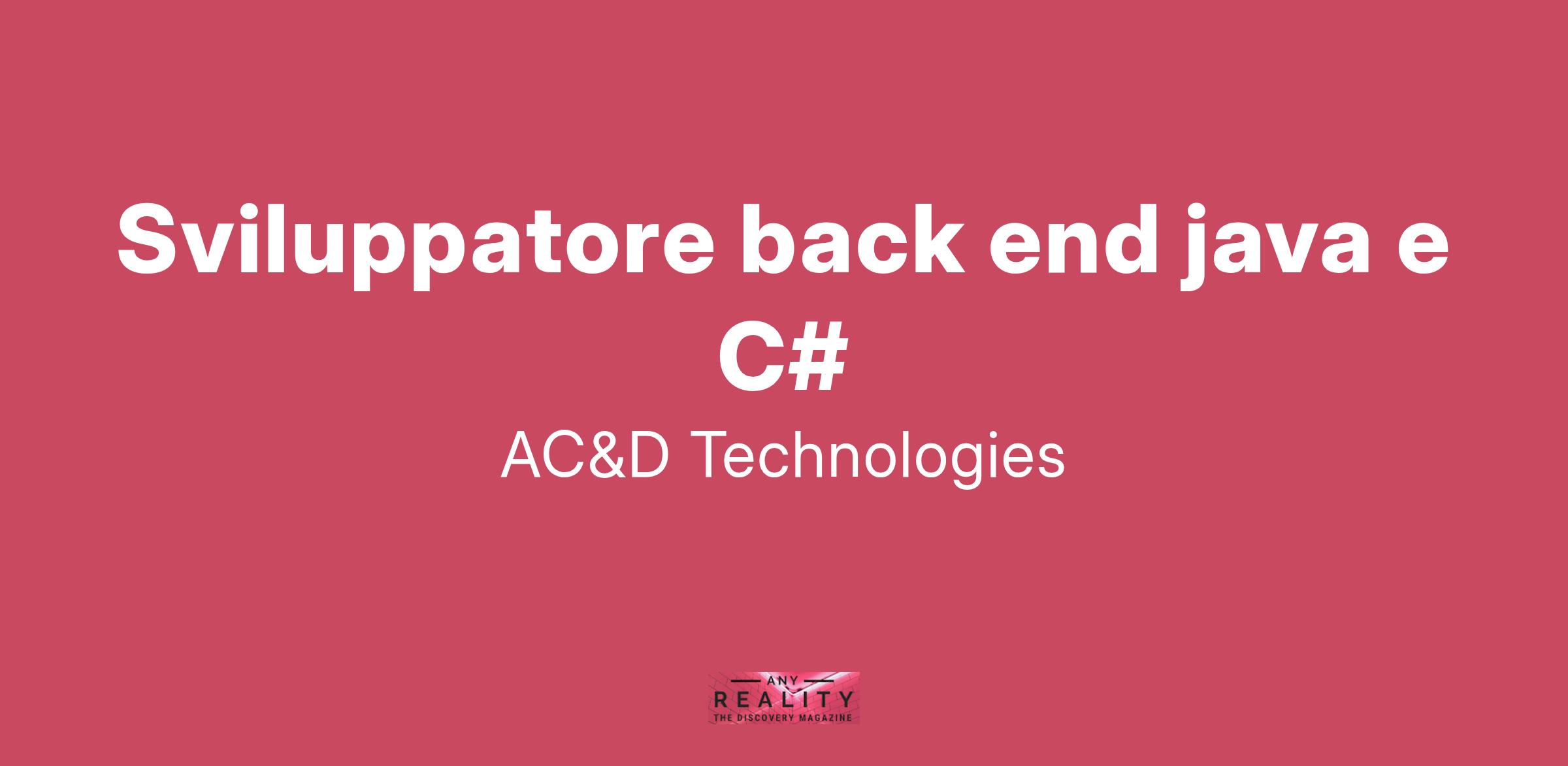 AC&D Technologies è una società di Consulenza, System Integration e Sviluppo applicativo da oltre 20 anni nel Settore ICT specializzata nella progettazione e nell’implementazione di soluzioni specifiche che rispondono ai criteri dell’eccellenza. Per ampliamento del nostro team ricerchiamo uno Sviluppatore back end java e C# Partecipa all’esperienza di innovazione tecnologica che viviamo ogni giorno in AC&D Technologies Candidati ora!.
