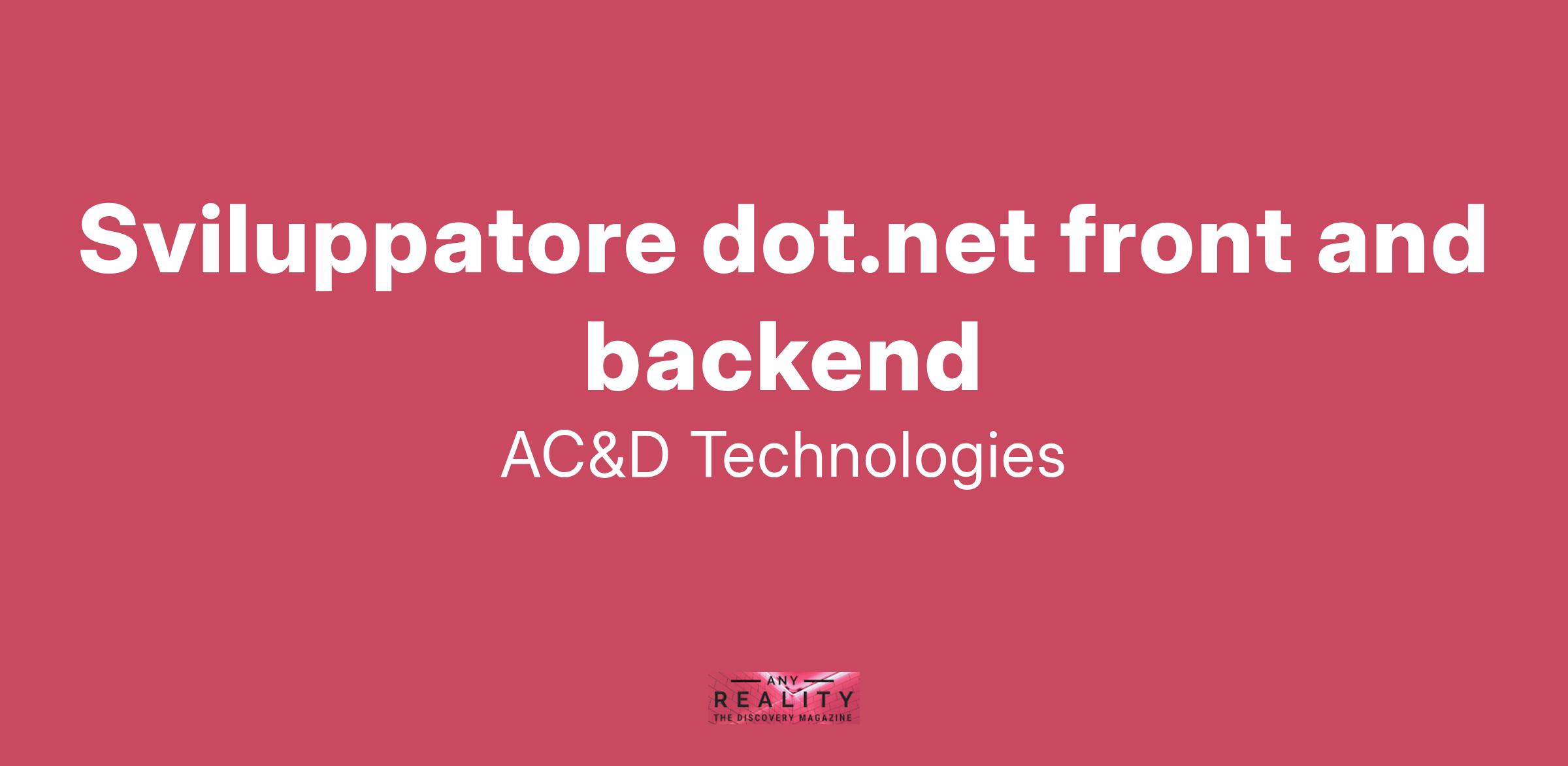 AC&D Technologies è una società di Consulenza, System Integration e Sviluppo applicativo da oltre 20 anni nel Settore ICT specializzata nella progettazione e nell’implementazione di soluzioni specifiche che rispondono ai criteri dell’eccellenza. Per ampliamento del nostro team ricerchiamo un Sviluppatore dot.net front and backend Partecipa all’esperienza di innovazione tecnologica che viviamo ogni giorno in AC&D Technologies Candidati ora!.
