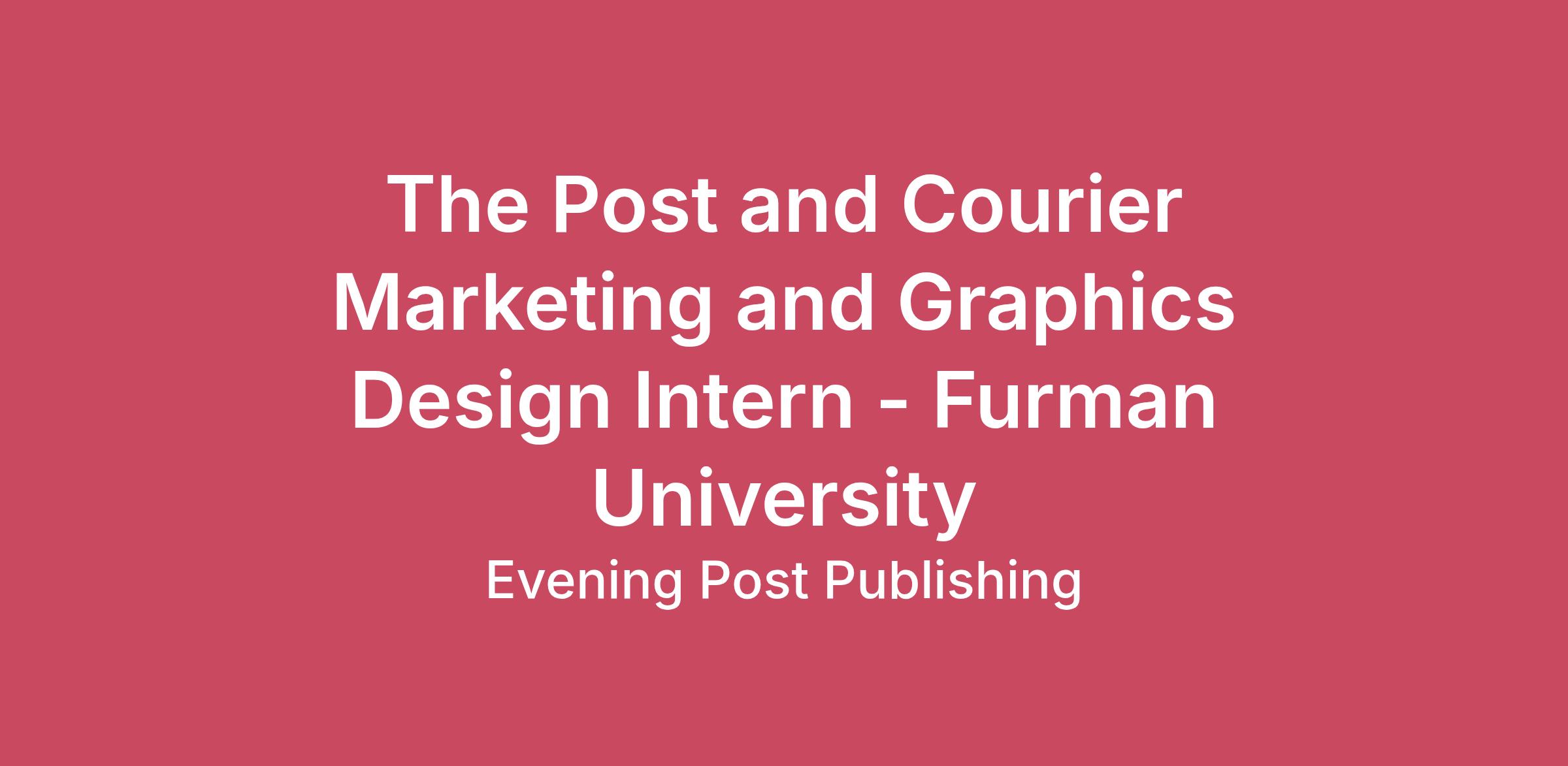 The Post and Courier is the on the lookout for a tenacious intern whos ready to dive into a variety of marketing strategies and assist in promoting our brands reach. This role offers an exciting opportunity to gain hands-on experience in every facet of marketing from strategy, event planning/execution and design. RESPONSIBILITIES: Create engaging graphics that will include print, digital advertising, email marketing and other marketing materials.Write copy for print and digital ads, social media, web, collateral and email marketing.Conduct email marketing campaigns with the goal of increasing engagement and conversion.Coordinate promotional opportunities to strengthen the position of The Post and Courier.Participate and work at events of The Post and Courier or to represent the brand.Perform other duties as assigned. Requirements, minimum education level, and experience: Currently enrolled at Furman UniversityStudies in marketing, communication, design or related field, or equivalent work experienceAbility to work independently remotely, if necessary, in a suitable workspace that meets safety guidelinesReliable access to internet service Knowledge, Skills and Abilities: Self-starter with the ability to work independently and within a collaborative, team environmentBackground in graphics for use on the print, web and social mediaIncredible attention to detail & capable of multi-tasking and coordinating several projects at onceEffective interpersonal and communication skillsExcellent planning and organizational skillsEffective project management skillsStrong copywriting skills and the ability to communicate complex ideasProficient with Microsoft Office, Adobe Software or other design softwareAbility to quickly learn and become proficient in new technologyAbility to react to change productively and handle other essential tasks as assignedPositive, professional demeanor, strong work ethic, and passion for the position and its opportunities Physical Requirements, Work Environment and Travel: Regularly required to sit, stand and walk for long periods of time. The job requires reaching with hands and arms, bending and stooping; light to moderate lifting of 15-30 pounds. The job requires hearing, speaking and writing with close eye work on a computer screen. The worker is generally subject to inside environmental conditions, which provide protection from weather conditions but not necessarily from temperature changes. Local travel may be required occasionally. The Post and Courier is an equal opportunity employer.