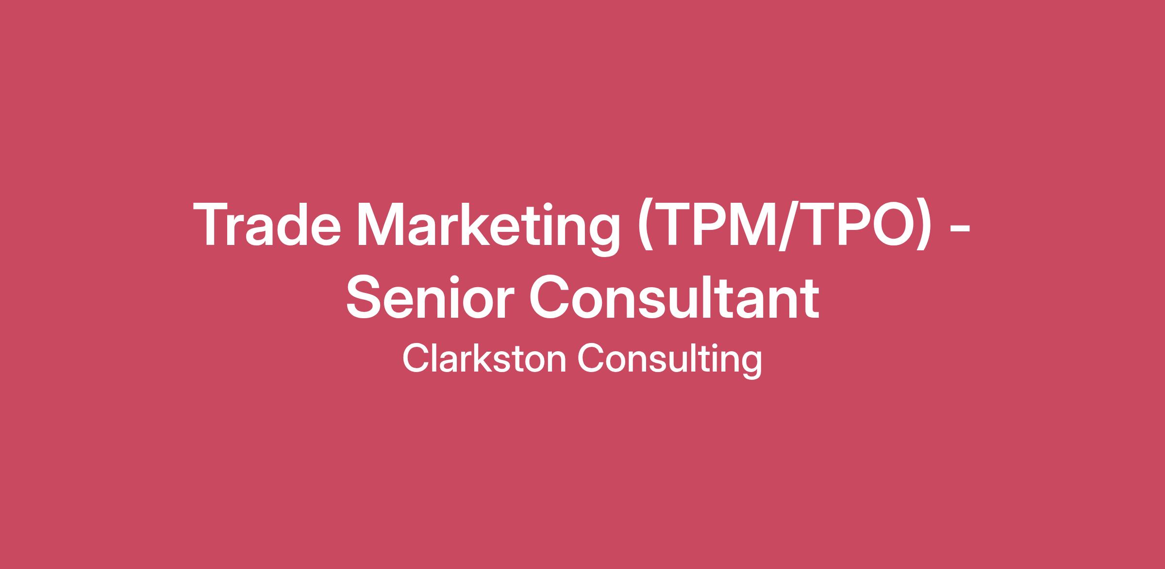 This job is posted in multiple locations. When not at a client site, consultants work from their home office. Relocation is not required.Clarkston Consulting is seeking motivated, self-driven leaders who are energized by team results and interested in joining a firm that values its culture and people as its biggest strengths. Come join us as a Trade Marketing (TPM/TPO) - Senior Consultant, and in this role you will deliver creative business solutions to our market-leading clients in the consumer products, and retail industries. Together, we can find the answers to our clients' most challenging business problems through a combination of our industry expertise, business process knowledge, and consulting excellence. What You’ll Do As a Trade Marketing (TPM/TPO) - Senior Consultant at Clarkston you will: Help leading consumer goods clients to define their trade promotion objectives, challenges, and operational processes Design and implement trade promotion optimization strategies that align with business goals. Leverage your experience with one or more trade systems (e.g., Salesforce, Telus, Kantar XTEL, etc.) to facilitate all aspects of a TPM implementation Translate business processes into functional requirements. This may include recommendations on leveraging current technologies and assessing software vendors based on organizational needs Share best practices, industry knowledge, and personal expertise to educate both clients and fellow consultants, in formal and ad hoc settings Assist in the creation and management of project plans and timelines, define project deliverables, identify and track issues and their resolution, and help to manage project scope and requirements Earn trusted client status and build relationships that extend beyond the project’s lifecycle Conduct knowledge transfer and training of end-users, including sharing best practices How You’ll Grow Beyond your day-to-day responsibilities, throughout your career at Clarkston you will: Receive the support and mentorship of your Clarkston colleagues and leaders Expand your existing skillset with internal and external professional development opportunities What We’re Looking For Minimum of 5 years of experience working in TPM, with relevant work experience in trade promotion optimization and/or revenue growth management In-depth understanding of Trade processes to include deductions, settlements, trade check requests, trade accruals, and trade finance (interfaces, reporting, etc.) Demonstrated experience as a TPM consultant working in an established professional services organization Flexibility and adaptability - our Senior Consultants work on all aspects of the trade process and related process and technology initiatives Direct experience with TPM systems such as Salesforce, Telus, Kantar XTEL, and others 4-year degree from an accredited college or university Travel Statement Travel is an integral part of this role and is estimated to average 30-50%. This may vary based upon client and project needs. When not traveling, consultants work from their home office. Relocation is not required. More About ClarkstonFounded in 1991, Clarkston Consulting delivers technology and management solutions to market leaders in the life sciences, consumer products, and retail industries. At Clarkston, we cultivate success - for our clients, for our people, and for our firm. We utilize a team approach leveraging our collective expertise and industry knowledge to solve our clients’ business challenges.AI StatementClarkston values thoughtful and responsible AI use for resume writing, interview preparation, and research. However, real-time use of AI to generate or script answers during interviews - including video or live conversations - is strictly prohibited and will lead to disqualification. We seek candidates who show authenticity, good judgment, and genuine engagement throughout the process. Our benefits include: Comprehensive Health and Wellness Benefits (Medical, Dental, Vision, and more) 401k with company contributions Paid vacation, personal days, holidays, and sick leave Paid Parental Leave and Family Building Benefits (Adoption, Surrogacy, and Infertility Support) Life and Disability Insurance Training and Professional Development investments, Tuition Assistance, and more Visit Careers at Clarkston Consultingto learn more about our culture, benefits, and opportunities.Clarkston Consulting is an equal opportunity employer. We are committed to ensuring our firm is rich in diverse skills, competencies, strengths, personalities, and culture. We foster an inclusive environment that embraces the unique contributions of our people to further our purpose. Please visit Diversity @ Clarkston Consulting to learn more about our diversity initiatives.