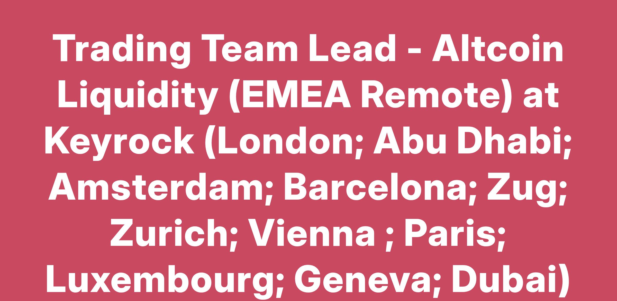 Trading Team Lead - Altcoin Liquidity (EMEA Remote) at Keyrock (London; Abu Dhabi; Amsterdam; Barcelona; Zug; Zurich; Vienna ; Paris; Luxembourg; Geneva; Dubai)