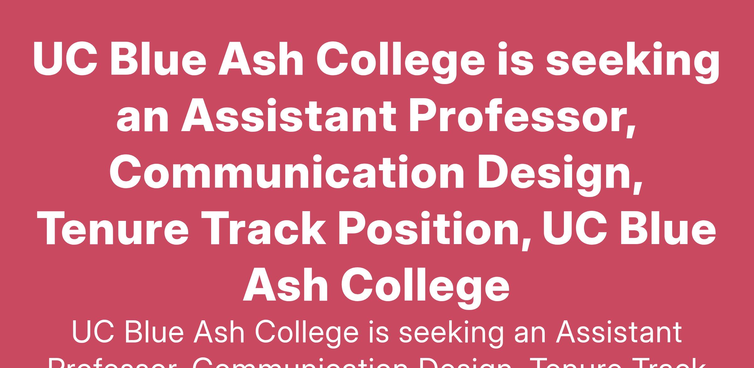 UC Blue Ash College is seeking an Assistant Professor, Communication Design, Tenure Track Position, UC Blue Ash College
