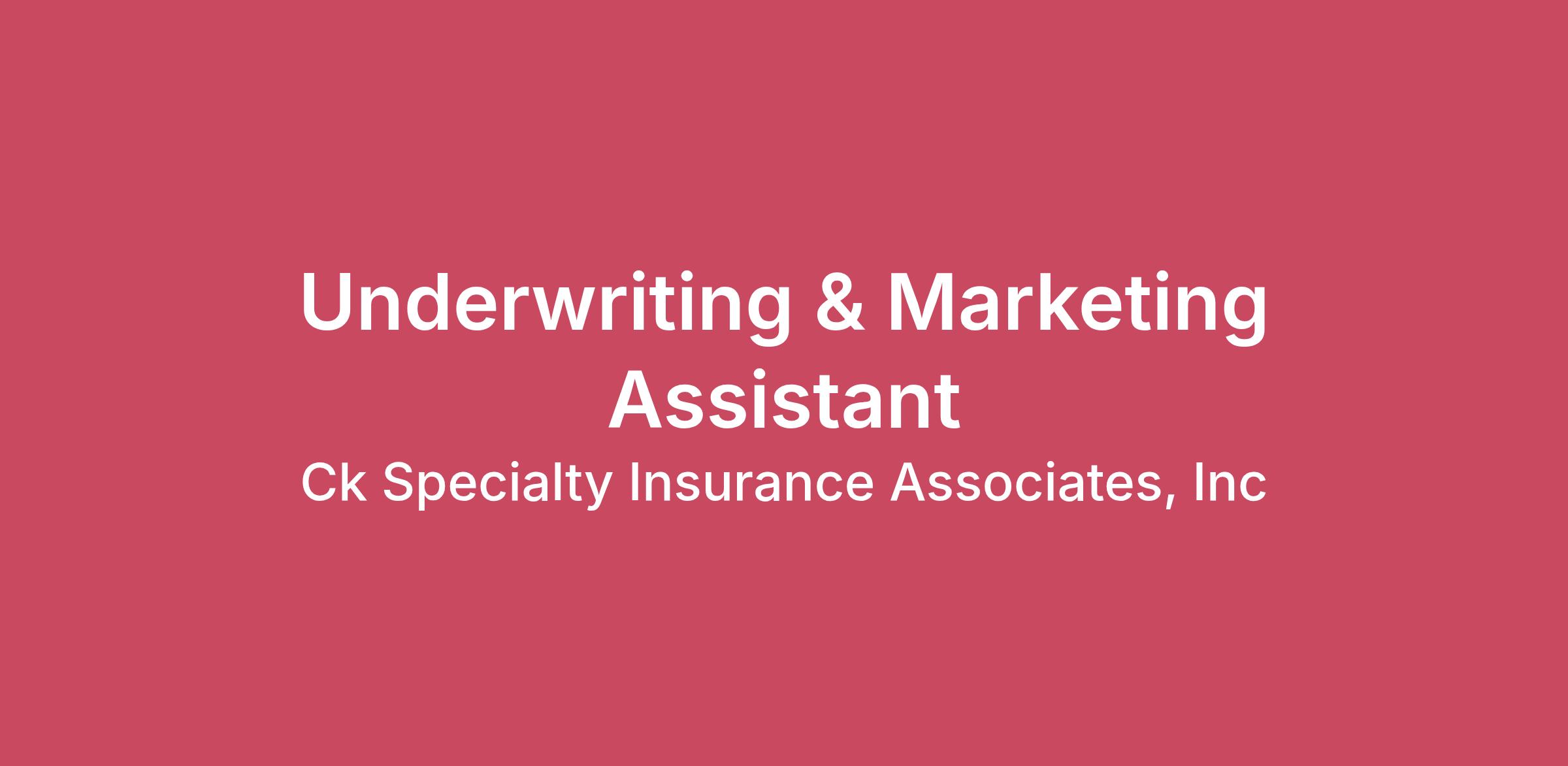 About Ck Specialty Insurance AssociatesCk Specialty Insurance Associates is a rapidly growing, independently owned wholesale insurance brokerage committed to providing innovative and customized insurance solutions to retail agents and brokers across the country. Founded with a strong entrepreneurial spirit, Ck Specialty was built on the foundation of speed, service, and partnership with our retail agents. Traits that remain at the core of everything we do.Since our inception in 1998, we have grown into a respected name in the Excess & Surplus (E&S) marketplace. We focus on a wide range of commercial and personal lines, offering access to top-rated carriers and niche products that meet the unique needs of today’s insurance buyers.At Ck Specialty, we operate with a 120% mentality; always going above and beyond in how we serve our clients, partners, and each other. We value precision, reliability, organization, and speed, which is why our team lives by the acronym PROS. We’re a company for self-starters, problem-solvers, and professionals who want to be part of something fast-moving and impactful.Why Join Ck Specialty? Supportive, high-energy team culture Room for growth and career development in a fast-scaling company Strong leadership that invests in training and development A voice at the table - your ideas matter here Whether you’re new to the insurance industry or bringing years of experience, Ck Specialty is a place where your contributions can make a real difference. We're proud of our track record, but even more excited about what's ahead.What You'll be DoingWe’re looking for a detail-oriented professional to join our team as an Underwriting Assistant with light marketing support responsibilities. This role focuses primarily on supporting underwriting operations while assisting with select outreach and data-support activities that help drive business development behind the scenes.The ideal candidate enjoys working with data, maintaining accurate records, supporting underwriters, and assisting with tools like Levitate for relationship management. Marketing involvement is supportive in nature only and may include data mining, contact list maintenance, and occasional introductory outreach or cold calls under direction. This position does not require travel and does not assume ownership of marketing strategy or execution, but instead provides operational support to ensure workflows remain organized, efficient, and responsive.Marketing & Agency Support - 20%Proactively identify and pursue new business opportunities to expand our customer base. Present targeted product lines to agencies and develop sales strategies to increase adoption. Develop and distribute engaging marketing materials, targeted campaigns, and travel to retail agencies to understand their needs. Create connections with coded producers, tailoring support to their experience and goals. Track agency interactions, monitor campaign performance, and provide reporting on growth opportunities. Provide feedback and contribute ideas for improving product sheets, marketing materials, and training resources. Underwriting Support - 80%Collaborate closely with the Underwriting team to ensure timely, accurate, and complete submission of documentation. Review incoming submissions for completeness and proactively resolve gaps before underwriter review. Input and update data within quoting systems and underwriting platforms to support efficient turnaround times. Serve as a liaison between brokers, clients, and underwriters to obtain missing details and clarify requirements. Maintain organized, up-to-date digital files and records to ensure compliance and accessibility. Track submission and quote progress, providing regular status updates to the Underwriting team and management. Assist in underwriting review of files, preparing quotes, and submitting to underwriters for approval. Support process improvements and workflow efficiencies to enhance productivity. Manage renewal lists, including renewal evaluation, shopping, quoting and follow up Proficient in documentation management and related systemsHighly organized with strong time-management skillsDetail-oriented with the ability to prioritize and shift between tasks efficiently in a fast-paced environmentPositive attitude and commitment to continuous growth and professional developmentComfortable handling a large workload and shifting focus as needed to meet deadlinesProactive and self-motivated, able to take initiative to follow up and resolve issuesPreferred Qualifications/ Experience1-3 years of Underwriting experienceExperience with Levitate, Canva, or similar CRM, marketing, or design tools 401(k) retirement plan Health, dental, and vision insurance Generous Paid Time Off, Vacation, and Sick leave Tuition reimbursement Disability insurance Remote work flexibility Exposure to a dynamic and fast-growing company, offering long-term financial independence and career flexibility.