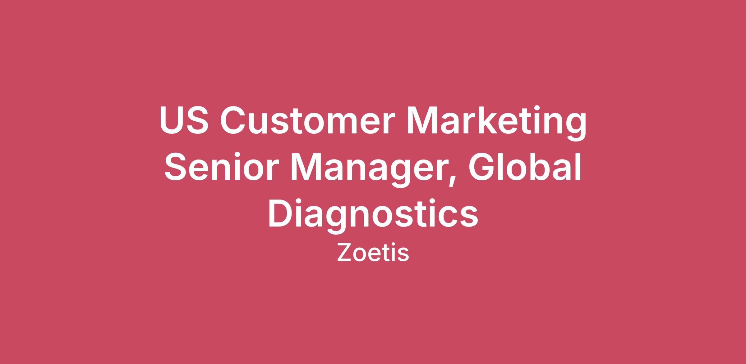 Location: Parsippany, NJ; Union City, CA; Remote possible. Role DescriptionThe US Customer Marketing Senior Manager, Global Diagnostics role is responsible for executing customer-focused marketing initiatives within the West US market, which is approximately $150 million in revenue. This role will develop and implement strategies to drive customer acquisition, retention, and engagement, ensuring Zoetis Diagnostics maintains a strong market presence. The role will work closely with sales teams to enhance field execution and support revenue growth through effective customer marketing programs. This position will leverage customer insights, market data, and competitive analysis to tailor marketing programs that align with the unique needs of the US veterinary diagnostics market. The role will also support demand generation, customer education, and utilization strategies to maximize the value of Zoetis’ diagnostic offerings. This position partners closely with the marketing leadership team, sales leadership & area business managers within region. Key Responsibilities · Market-Specific Strategy: Develop and execute customer marketing strategies tailored to the US region ($150 million in revenue) · Customer Acquisition & Retention: Lead initiatives to attract new customers and enhance retention through targeted programs. · Sales Team Collaboration: Work closely with sales teams to ensure marketing initiatives effectively support field execution. · Demand Generation: Drive demand generation campaigns, including digital marketing, events, and targeted outreach. · Customer Insights & Segmentation: Conduct customer research and segmentation to optimize marketing initiatives. · Marketing Program Execution: Implement marketing programs that drive engagement, utilization, and loyalty. · Performance Measurement: Monitor and analyze marketing performance to refine strategies and maximize impact. · Cross-Functional Collaboration: Partner with portfolio marketing, finance, and operations to align marketing activities with business objectives. Key Skills and Qualifications · Education: Bachelor’s degree in Business, Marketing, Life Sciences, or related field; MBA preferred. · Experience: 12+ years of sales and/or marketing experience in diagnostics, medical devices, or animal health, with a strong background in customer engagement. · Customer-Focused Mindset: Proven ability to develop and execute marketing programs centered on customer needs. · Sales & Marketing Collaboration: Strong track record of working closely with sales teams to drive commercial success. · Analytical Skills: Experience in market analysis, customer segmentation, and performance measurement. · Communication & Influence: Excellent communication skills with the ability to engage internal and external stakeholders. · Project Management: Strong ability to manage multiple marketing initiatives and execute effectively. Travel Requirement Regular travel within the US as required. The US base salary range for this full-time position is $129,000 - $209,000. Our salary ranges are determined by role, level, and location. The range displayed on each job posting reflects the base pay target range for new hire salaries for the position. Within the range, individual pay is determined by work location and additional factors, including job-related skills, experience, and relevant education or training. This position is also eligible for short-term incentive compensation.This position is also eligible for long-term incentives. In addition to compensation, Zoetis offers a comprehensive benefits package that supports the physical, emotional and financial wellbeing of our colleagues and their families including healthcare and insurance benefits beginning on day one, a 401K plan with a match and profit-sharing contribution from Zoetis, and 4 weeks of vacation. Visit zoetisbenefits.com to learn more. Full time Regular Colleague Any unsolicited resumes sent to Zoetis from a third party, such as an Agency recruiter, including unsolicited resumes sent to a Zoetis mailing address, fax machine or email address, directly to Zoetis employees, or to Zoetis resume database will be considered Zoetis property. Zoetis will NOT pay a fee for any placement resulting from the receipt of an unsolicited resume.Zoetis will consider any candidate for whom an Agency has submitted an unsolicited resume to have been referred by the Agency free of any charges or fees. This includes any Agency that is an approved/engaged vendor but does not have the appropriate approvals to be engaged on a search. Notice: Zoetis Recruiters will contact candidates via email from an address ending in @zoetis.com and may also initially connect with candidates through LinkedIn, including LinkedIn InMail. Zoetis does not use Gmail, Outlook, Yahoo, or other web-based/generic email domains to communicate about job opportunities, interviews, or offers of employment. If you receive a recruitment-related email message claiming to be from Zoetis that does not come from @zoetis.com, please treat it as suspicious. For your security, do not reply, click links, open attachments, share personal or financial information, or send money in response to unexpected or questionable recruitment communications. Zoetis is committed to equal opportunity in the terms and conditions of employment for all employees and job applicants without regard to race, color, religion, sex, sexual orientation, age, gender identity or gender expression, national origin, disability or veteran status or any other protected classification. Disabled individuals are given an equal opportunity to use our online application system. We offer reasonable accommodations as an alternative if requested by an individual with a disability. Please contact Zoetis Colleague Services at zoetiscolleagueservices@zoetis.com to request an accommodation. Zoetis also complies with all applicable national, state and local laws governing nondiscri