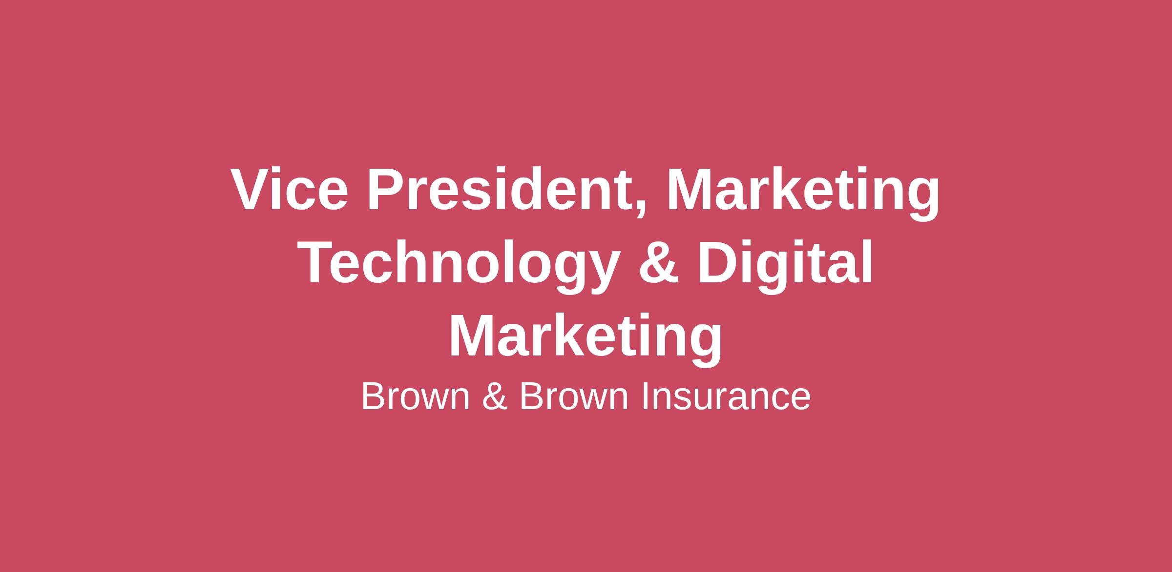 Built on meritocracy, our unique company culture rewards self-starters and those who are committed to doing what is best for our customers.Brown & Brown is seeking a Vice President, Marketing Technology & Digital Marketing to join our team!The Vice President, Marketing Technology & Digital Marketing will lead our full-funnel MarTech roadmap and digital marketing efforts. This role is essential for bringing our future digital customer experience to life, evolving our approach to marketing automation and creating a connected ecosystem across the customer journey. The role will apply a blend of creative thinking, analytical processes and change management experience to meaningfully expand our digital marketing capabilities while optimizing performance to improve business outcomes. Experience leading a full-funnel digital marketing capability with an omnichannel approach is critical for success in the role.How You Will Contribute:Own enterprise digital marketing and MarTech as a primary growth engine, directly accountable for pipeline acceleration, revenue impact, and organic growth.Convert executive growth priorities into aggressive, multi-year digital and MarTech roadmaps, tightly sequenced to unlock scale, speed, and measurable sales impact.Allocate investment across paid, owned, and earned channels to maximize ROI, with clear performance targets for SEO, PPC, demand generation, and conversion.Optimize high-impact digital channels and platforms (website, portals, email, apps) to drive acquisition, cross-sell, and producer productivity across the customer lifecycle.Integrate lead generation, routing, CRM, and campaign execution to increase sales velocity, improve win rates, and eliminate leakage across the funnel.Enforce governance, standards, and performance KPIs tied to pipeline contribution, sales-qualified leads, conversion rates, and revenue outcomes.Continuously deploy emerging technologies and automation to scale growth, improve forecasting accuracy, and create a durable competitive advantage.Skills & Experience to Be Successful:Bachelor’s degree in marketing, information technology or a related field; advanced degree preferred.Minimum of 10 years of experience in digital marketing transformation and marketing technology.Exceptional analytical skills and attention to detail.Experience building and scaling cross-functional programs from concept to completion.Experience with Dynamics 365, Power BI, Google Analytics, App Insights, various website platforms, content management systems, SEO, SEM and attribution models is preferred.Pay Range$165,000 - $180,000 AnnualThe pay range provided above is made in good faith and based on our lowest and highest annual salary or hourly rate paid for the role and takes into account years of experience required, geography, and/or budget for the role.Teammate Benefits & Total Well-BeingWe go beyond standard benefits, focusing on the total well-being of our teammates, including:Health Benefits: Medical/Rx, Dental, Vision, Life Insurance, Disability Insurance Financial Benefits: ESPP; 401k; Student Loan Assistance; Tuition Reimbursement Mental Health & Wellness: Free Mental Health & Enhanced Advocacy ServicesBeyond Benefits: Paid Time Off, Holidays, Preferred Partner Discounts and more. Not reflective of all benefits. Enrollment waiting periods or eligibility criteria may apply to certain benefits. Benefit details and offerings may vary for subsidiary entities or in specific geographic locations. The Power To Be Yourself As an Equal Opportunity Employer, we are committed to fostering an inclusive environment comprised of people from all backgrounds, with a variety of experiences and perspectives, guided by our Diversity, Inclusion & Belonging (DIB) motto, “The Power to Be Yourself”.