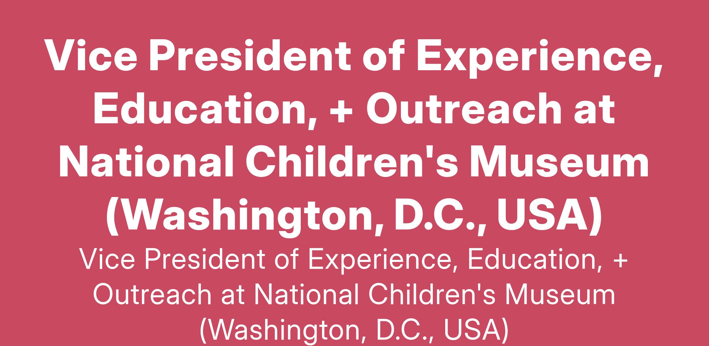Vice President of Experience, Education, + Outreach at National Children's Museum (Washington, D.C., USA)