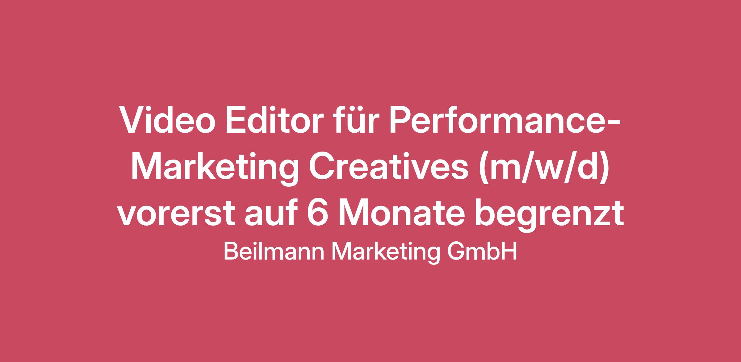 Warum Beilmann Marketing? Wir suchen ab sofort Verstärkung im Bereich Video Editing mit Google Ads Bei Beilmann Marketing arbeiten wir mit einem klaren Ziel vor Augen: Als eine der führenden Google & YouTube Ads Agenturen in Europa wollen wir das maximale Wachstum für bekannte Kunden wie Loop Earplugs, Paper & Tea und Sternglas erzielen. In einem Team aus mehr als 40 Expert:innen, die alle für ihren Bereich brennen, setzen wir auf datengetriebenes Performance Marketing und die gesamte Bandbreite der Google-Kanäle, um langfristige Erfolge zu sichern. Werde Teil unseres Teams und wachse mit uns! Was dich erwartet: Einzigartige Wachstumschance: Du wirst Teil eines ambitionierten und motivierten Team aus Experten, die sich gegenseitig jeden Tag zur Höchstleistung animieren. Weiterbildung auf allen Ebenen: Es gibt regelmäßige Masterclasses, die sich jeweils auf die Experten-Gebiete der Agentur konzentrieren. So lernst du etwas aus deinem Bereich, aber auch direkt über den Tellerrand hinauszublicken. Neben internen Masterclass gibt es natürlich auch externe Ressourcen, um dich jeden Tag NOCH ein bisschen besser werden zu lassen. Das vielleicht wertvollste Coaching deines Lebens: Unser Performance-Coach Davud ist mittlerweile für uns alle wie ein Freund, der sich individuell die Herausforderungen des Alltags einer Remote-Agentur ansieht und uns allen dann dabei hilft, möglichst ausgeglichen, glücklich und leistungsfähig zu sein. Und diese Maßnahmen wirken sich tatsächlich auf dein gesamtes Leben aus. Kurz: Wir lieben Davud. Und du wirst das auch. Flexibilität: Arbeite zu 100 % remote und flexibel – bei uns bist du Teil eines agilen Teams, das ständig nach neuen Best Practices strebt. Und du kannst dir natürlich deinen ganz eigenen Tagesablauf bauen – egal, wo du gerade in Europa bist. 2 Workations pro Jahr: Wir haben richtig geile Workations! Und das mehrfach im Jahr. Dort kommen wir aus allen Ländern in einer Villa zusammen und können eine ganze Woche am Stück gemeinsam leben, arbeiten – und verdammt viel Spaß haben. Das Highlight des Jahres! Homeoffice-Ausstattung: Natürlich bekommst du auch eine standesgemäße Homeoffice-Ausstattung. (MacBook etc.) Kollaboratives Umfeld: Wir sind eine mittlerweile anerkannte Agentur – aber mit Start-up Flair. Deswegen wird stets offen kommuniziert – weil wir nur so gemeinsam wachsen können. Deine Aufgaben Du findest passendes Bild- und Videomaterial, ergänzt es durch Motion-Design-Elemente und passende Sounds Du erstellst hochperformante Direct Response Video Ads Gemeinsam mit der Art Directorin optimierst Du kreative Konzepte und entwickelst diese weiter Du nutzt die Adobe Creative Suite (Premiere Pro, After Effects, Photoshop, Illustrator) für Deine Designs Du setzt passgenau die Brandings unserer Kunden in Videos und Designs um Ab und zu erstellst du auch Content für unser eigenes Agentur-Marketing Dein Profil Wichtig! Wir suchen Video Editor:innen mit Erfahrung im Performance Marketing. Du hast bereits mehrjährige Erfahrung im Bereich Video Editing für Performance Marketing Ads (YouTube, Meta, Google) Du hast ein fundiertes Verständnis von Performance-Zielen (z. B. CTR, Conversion Rate, Retention) und setzt Schnitt, Visuals und Storytelling gezielt ein, um diese zu erreichen Sehr gute Kenntnisse in Premiere Pro und/oder After Effects und idealerweise Figma Du bringst eigene kreative Ideen proaktiv ein Du übernimmst Verantwortung für deine Projekte, hältst Deadlines zuverlässig ein und behältst auch in stressigen Phasen einen kühlen Kopf Effizienz und konstant hohe Qualität zeichnen deine Arbeit aus Sehr gute Deutsch- und Englischkenntnisse (Deutsch mind. C1) in Wort und Schrift Du bist ein echter Teamplayer und hast Freude daran, gemeinsam die bestmögliche Performance zu erzielen