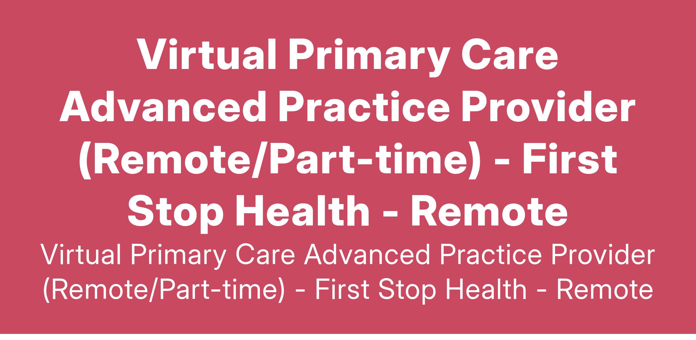 First Stop Health is in search of part-time advanced practice providers to join our Virtual Primary Care team. First Stop Health’s mission is to help our employer clients reduce their overall health claims spend by serving their members virtually, keeping them away from in-person medical care when possible. Our primary care providers will treat patients virtually, via phone or video call, serving their episodic, chronic, and preventive care needs.