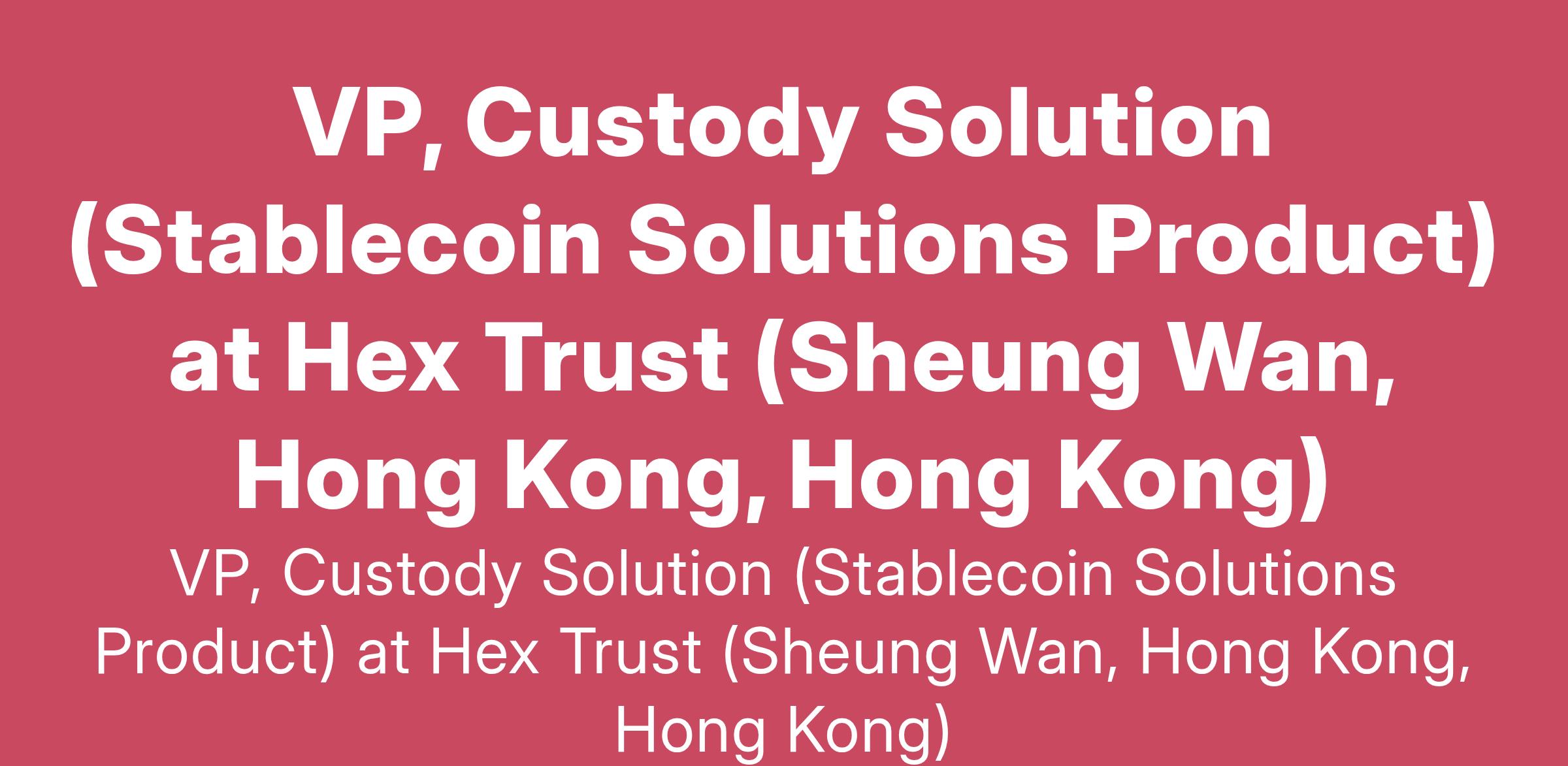 VP, Custody Solution (Stablecoin Solutions Product) at Hex Trust (Sheung Wan, Hong Kong, Hong Kong)