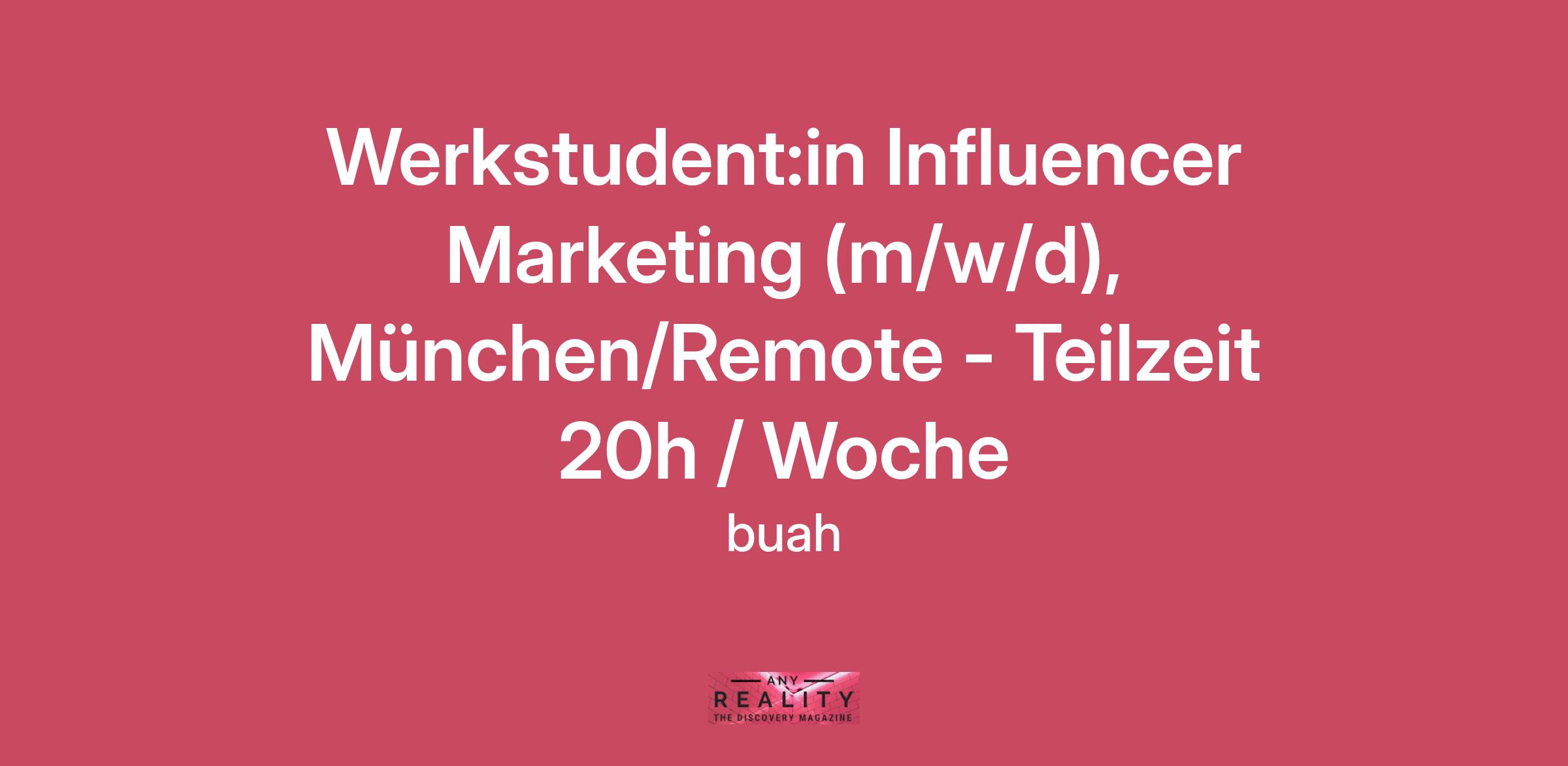 WER WIR SINDWir sind buah – gegründet 2015, ein Team mit Herz, Know-how und Leidenschaft, das es unter die Top 26 der deutschen Start-ups geschafft hat! Unsere Mission ist es, Begeisterungsmomente zu schaffen. Wie? Mit innovativen Produkten im Bereich Healthy Snacks und durch unsere Qualität als Arbeitgeber. Hast Du Lust auf eine Arbeit, die Freude macht? Dann bist Du bei uns genau richtig. Mit unseren flexiblen Arbeitsmodellen – ob im Büro, hybrid oder komplett remote – unterstützen wir Deine Stärken und individuelle Arbeitsweise. Werde Teil einer Bewegung, die die Welt der Snacks neu definiert – werde Teil von buah! WAS DU IM GEPÄCK HASTStudium: Du studierst Wirtschaftswissenschaften, Kommunikationswissenschaften, Marketing oder einen ähnlichen Studiengang und befindest Dich mindestens im 3. Semester Deines Bachelorstudiums.Zeitumfang: Du stehst min. 20 Stunden in der Woche zur Verfügung und studierst mind. noch 3 Semester.Berufserfahrung: Idealerweise konntest Du bereits Erfahrung im Influencer Marketing sammeln. Leidenschaft und Interesse: Für alles rundum Social Media, Influencer:innen und Content Creator:innen.Verhandlungsgeschick und Kommunikationsstärke zur erfolgreichen Akquise und Gewinnung neuer Kooperationspartner.Analytische Fähigkeiten: Ausgezeichnete analytische Fähigkeiten.Zielorientiert: Du setzt Dir realistische, aber ambitionierte Ziele.Gewissenhaft: Einhaltung von Deadlines und Pünktlichkeit.Strukturiert: Planungs-/Organisationstalent und eine strukturierte ArbeitsweisePositive Mindset: Du hast Leidenschaft und Freude bei der Arbeit.Arbeitsmoral: Ein hohes Maß an Eigeninitiative und Teamfähigkeit.Sprachen: Deutsch und Englisch.WAS WIR DIR ANBIETEN KÖNNENWir leben die Möglichkeiten der digitalen Welt und arbeiten (fast) alle 100% Remote - daher hast du bei uns maximale Freiheit und Flexibilität. Gleichzeitig schätzen wir aber auch den Face to Face Austausch und kommen regelmäßig zu Teammeetings & -events sowie Coworking zusammen.Was noch?Kultur und Werte: Bei uns steht die Gemeinschaft im Mittelpunkt, die unsere buah-Werte lebt und vorantreibt.Flexible Arbeitszeiten: Deine Arbeitszeit kannst Du, neben den Kernarbeitszeiten weitgehend selbst gestalten. Es ist uns wichtig, dass du Arbeit und Work-Life-Balance gut unter einen Hut bekommst.Schnelle Entscheidungsfindung: Wir bieten ein dynamisches Arbeitsumfeld mit flachen Hierarchien.Moderne Arbeitstools: Als digitales Unternehmen setzen wir auf die neuesten Tools für effizientes Arbeiten.Impact: Deine Arbeit hat direkten Einfluss auf unseren Erfolg – Du bist mehr als nur ein Rädchen im Getriebe.Zusätzliche Vorteile: Wähle ein Laptop nach Wunsch, genieße monatliche Vorteile wie Gutscheine im Wert von 50€ (Givve-Card oder Wellpass), und ein großartiges Team!DEIN BEITRAG ZUR ERFOLGSGESCHICHTEAls Werkstudent:in im Influencer Marketing hilfst Du unserem 40-köpfigem Team dabei unsere Mission “From Farm to Table” voranzutreiben. Du bist dafür zuständig, dass so viele Menschen wie möglich uns nachhaltig über Instagram über Nano- und Mikroinfluencer:innen kennenlernen & uns in ihren Alltag integrieren.ZUSTÄNDIGKEITResearch: Du nutzt unsere Tools für die Suche und Evaluation von potentiellen neuen Influencer:innen.Planung, Verhandlung und Kommunikation: Mit Hilfe von Leitfäden übernimmst Du die komplette Abwicklung der Kooperationen in Deinem Portfolio vom Erstkontakt bis zur Analyse. Hier garantieren wir Dir eine hohe Lernkurve.Reporting: Auf der Basis vorgegebener Parameter erstellst Du für Dein Portfolio eigenständige Reportings und entscheidest auf der Grundlage über die weitere Zusammenarbeit.Unterstützung Influencer Marketing: Du unterstützt das Influencer Marketing Team außerdem bei der Abwicklung der Kooperationen bei der Erstellung von Rabattcodes und dem Versenden von Influencerpaketen.Wir freuen uns darauf dich kennenzulernen!Wir haben Dein Interesse geweckt? Dann ran an die Tastatur – erzähl uns gern, warum Du Teil der buah Familie werden möchtest.Je aussagekräftiger Deine Bewerbung ist, desto besser können wir einschätzen, ob wir zueinander passen – und umso größer ist die Chance, dass wir uns persönlich kennenlernen.
